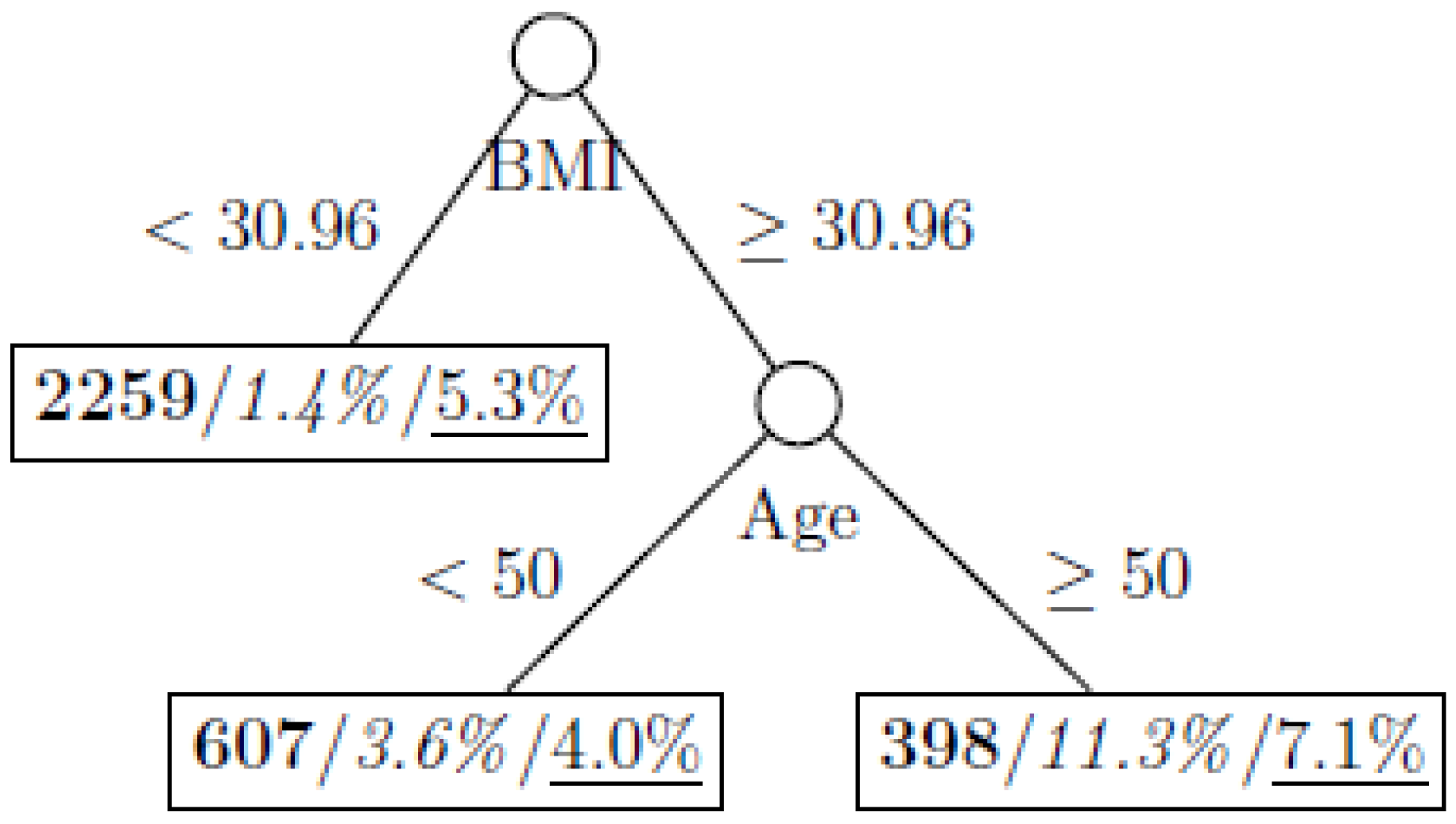 Decision tree model fitted using the weighted training dataset (number in bold/italic/underline: sample size of the node/percentage of undiagnosed diabetes in the training dataset/percentage of undiagnosed diabetes in the testing dataset respectively).