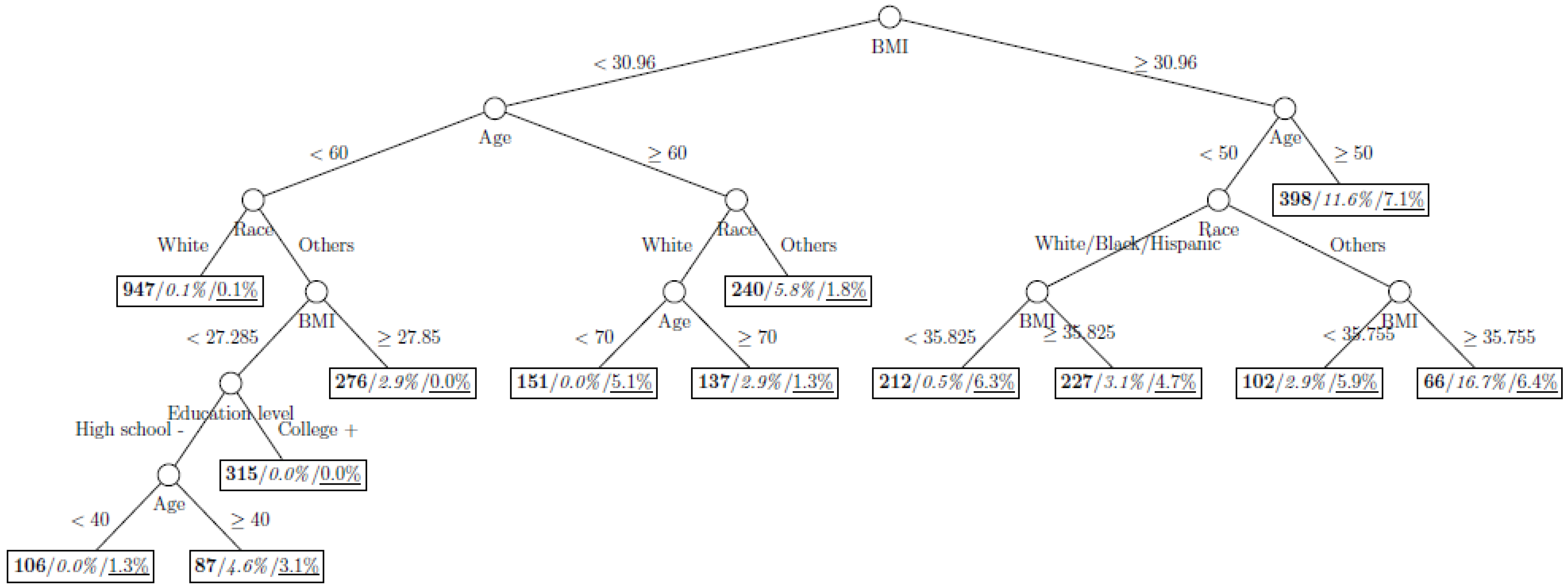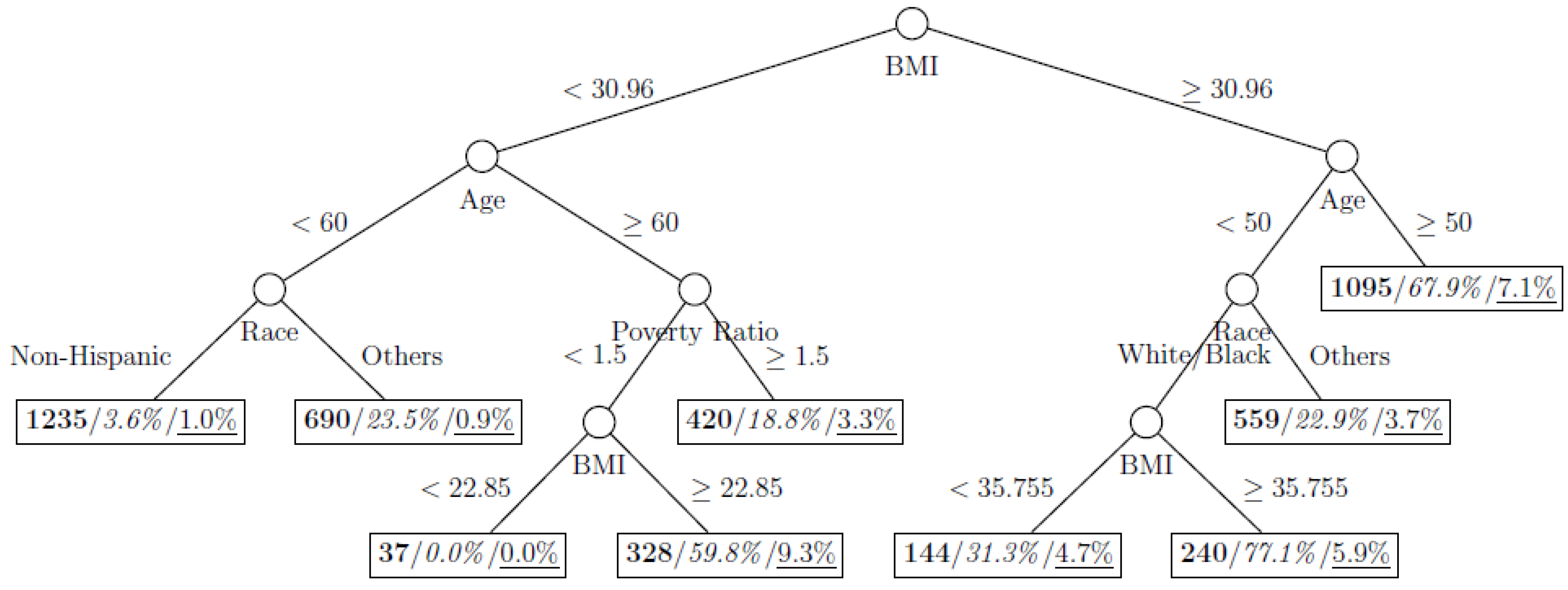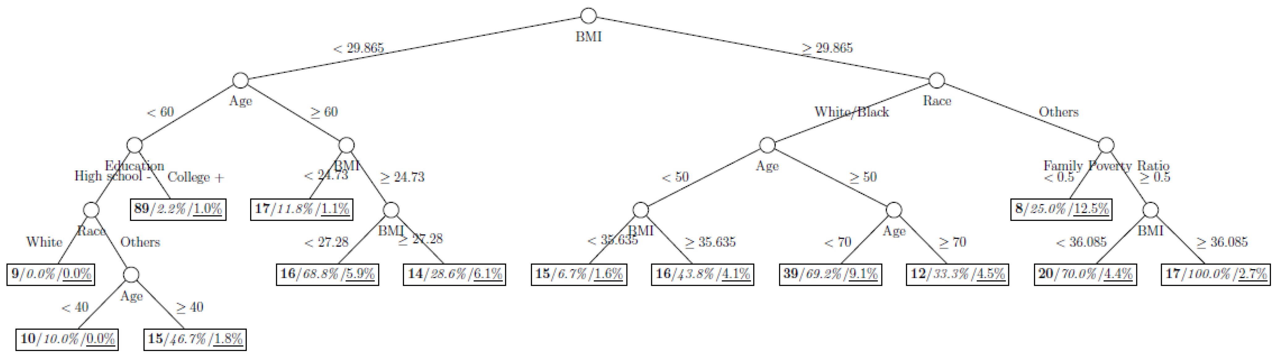 Figure 8 show the decision tree model fitted using the CART algorithm on the full, weighted, oversampled (case-to-control ratio 1:1, 1:2, and 1:4), and undersampled (case-to-control ratio 1:1, 1:2, and 1:4) training dataset respectively. They have 3, 13, 12, 14, 15, 15, 9, and 12 partitions respectively. Tree on full training data included two (BMI and age) exposure variables and other trees included four to six exposure variables. It was obvious that the tree model fitted on the full training dataset was an underfit. In fact, the tree model fitted on the oversampled training dataset was an extension of that on the full training dataset, with the partitions “BMI < 30.96” and “BMI ≥ 30.96 and Age < 50” further split into nine and five partitions respectively. The decision trees across different case-to-control ratios were similar. In decision trees fitted on the oversampled and undersampled training dataset with case-to-control ratio of 1:1, the partition having the highest incidence of diabetes had similar characteristics (oversampled: BMI ≥ 35.47 and Age < 50 and Race = others, undersampled: 30.96 > BMI ≥ 27.29 and Age < 60 and Race = other and Family Poverty Income Ratio < 0.5). The decision trees fitted on the weighted training dataset was nearly the same with that on the oversampled training dataset with case-to-control ratio of 1:1.