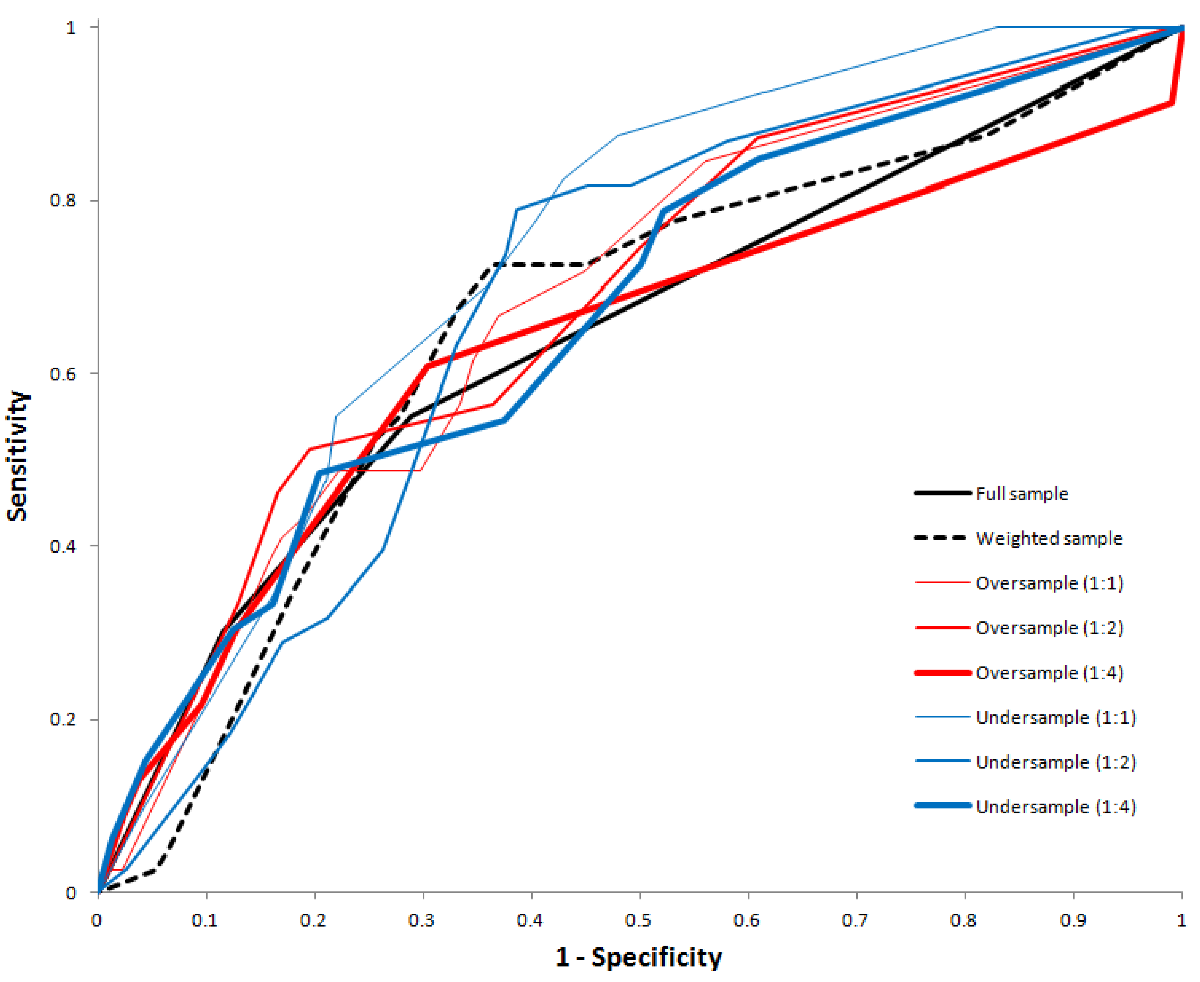 Table 4). For generalized boosted trees, those fitted on full training dataset, weighted training dataset, and undersampled training datasets demonstrated good fit, and the undersampled dataset with case-to-control ratio 1:1 yielded the best classification power, although the specificity is zero (