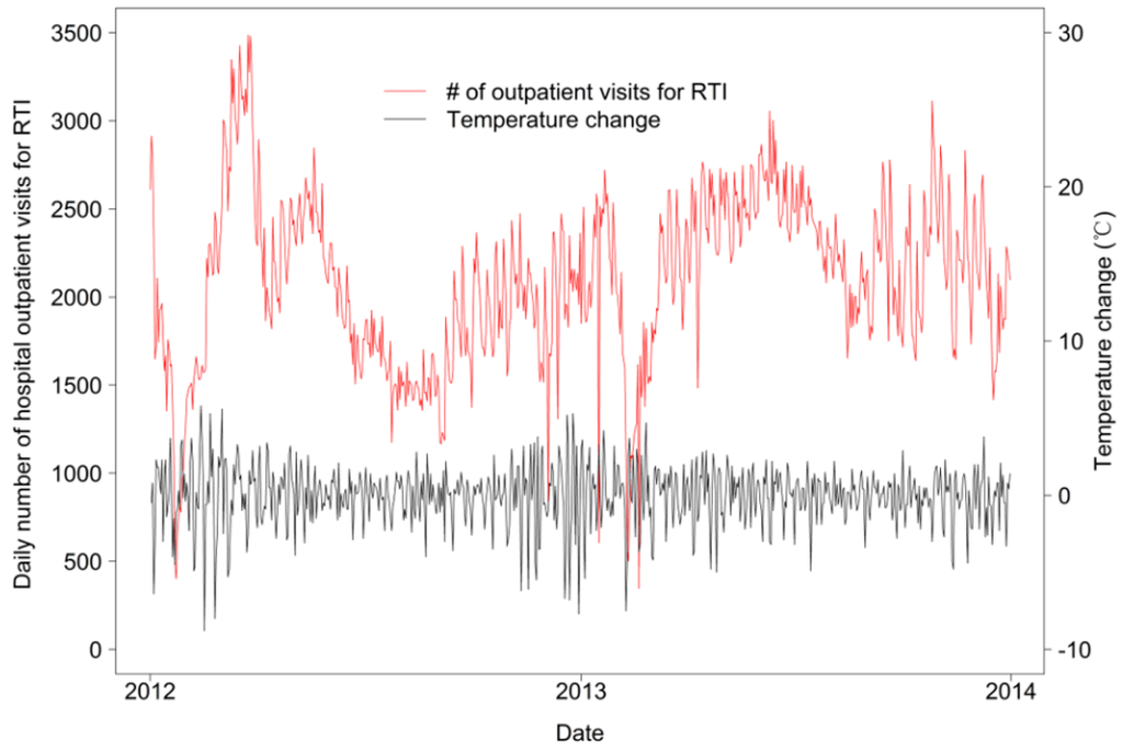 Daily number of outpatient visits for respiratory tract infections (RTIs) and temperature change versus time (January 2012–December 2013).