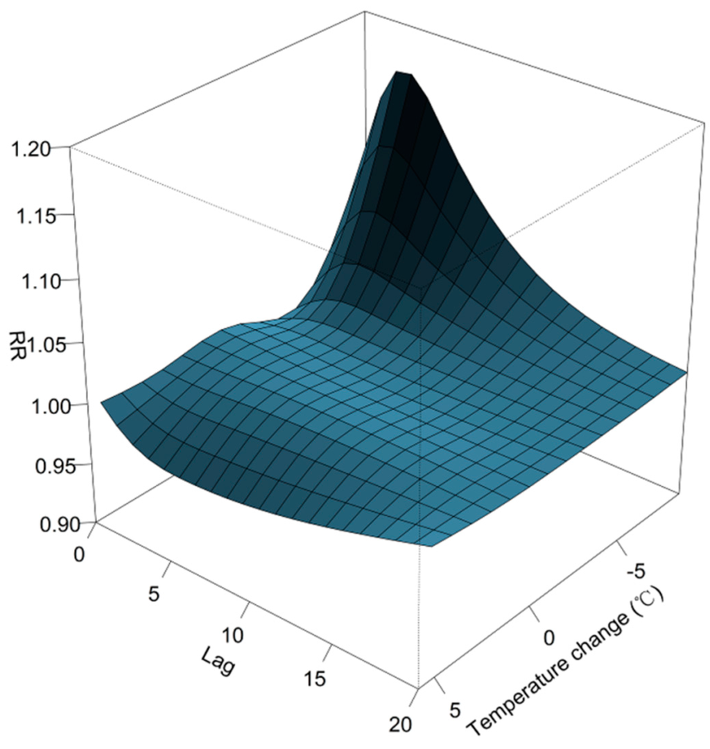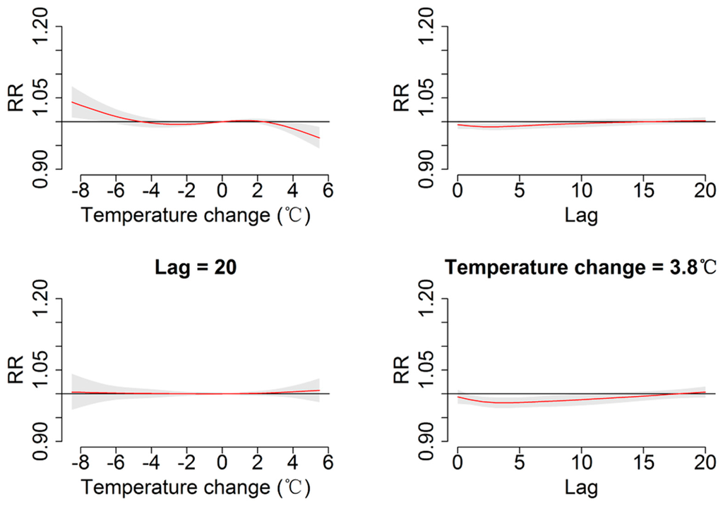 | Lag (day) | RR (95% CI) for Temperature Change | |||
