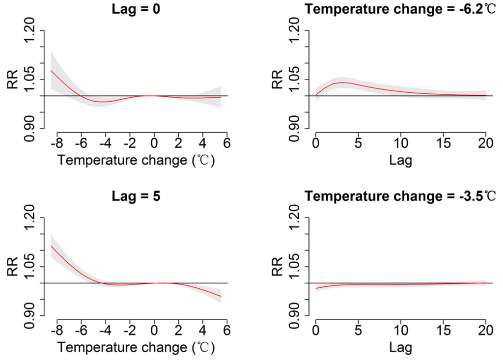 Plot of relative risk (RR) by temperature change at specific lags (left), RR by lag at 1st (−6.2 °C), 5th (−3.5 °C), 95th (2.9 °C) and 99th (3.8 °C) percentiles of temperature change distribution (right). The reference value was 0 °C temperature change.