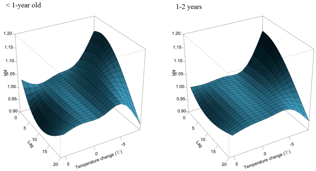 In the present study, a novel DLNM was used to examine the association of daily outpatient visits for childhood RTIs with temperature changes in Guangzhou. The DLNM allows for estimation and statistical testing of a non-linear and delayed effect [25,26]. Our results showed the association between RTIs and temperature was non-linear. We demonstrated that a relatively large decrease in temperature between consecutive days increased the risk of outpatient visits for RTIs. Lagged effects of temperature change on outpatient visits among children with RTIs were also observed. The delayed effect of a temperature decrease could last ~10 days, and the maximum effect of a temperature drop was seen on lag days 2~3. Children aged 0–2 years, and especially those aged <1 year, were particularly vulnerable to the effects of a temperature drop on their respiratory health.