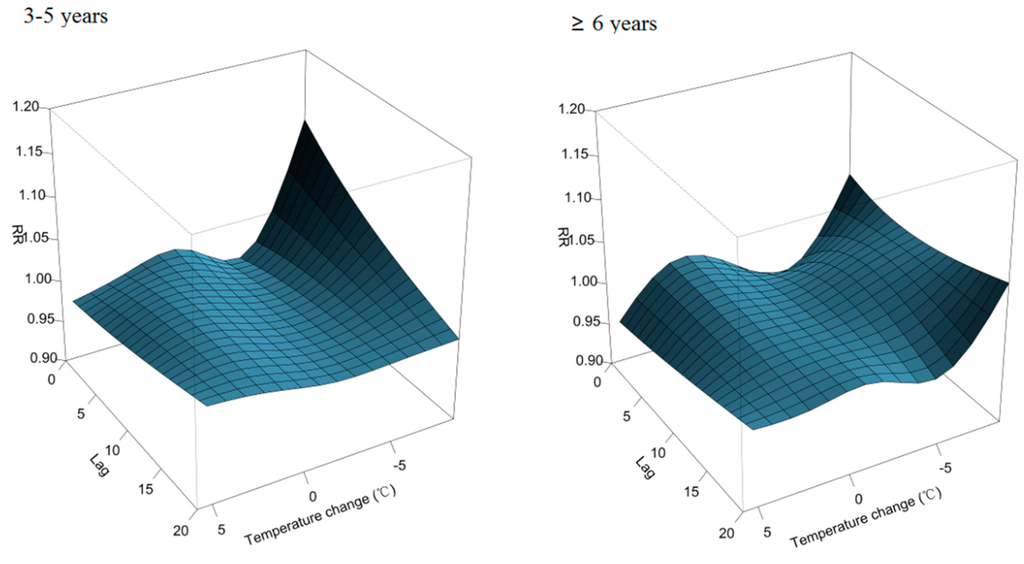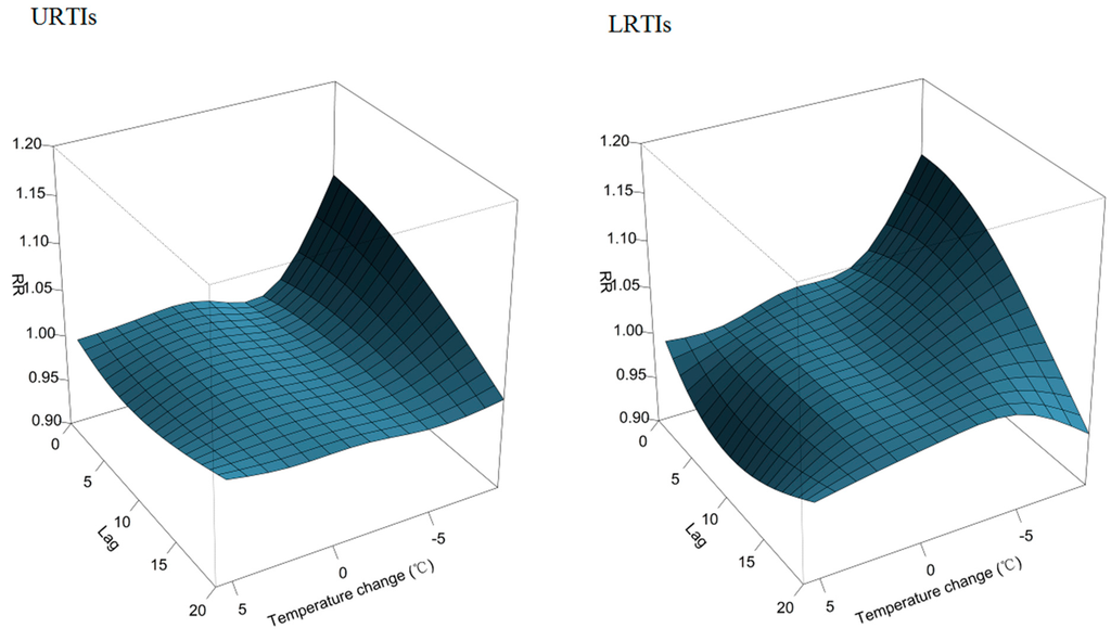 The overall effects of temperature change on daily outpatient visits for RTIs are depicted in Figure 2. The plot shows a nonlinear relationship between temperature and patient visits for RTIs. Inspection of the 3-D graph suggests that a large temperature decrease coincided with an immediate increase in the number patient visits for RTIs, while an increase coincided with a decreased number of visits. The maximum effect of a temperature drop (−8.8 °C) was reached at lag days 2~3 after its occurrence (RR: 1.16; 95% CI: 1.11, 1.22). As illustrated in Figure 3, the RR of RTIs by temperature change at specific lag periods (0, 5, 10, and 20 days) and by the lag at specific temperature changes (−6.2, −3.5, 2.9, and 3.8 °C), corresponded to approximately the 1st, 5th, 95th, and 99th percentiles, respectively, of the temperature change distribution in Guangzhou. The effects of temperature change on daily outpatient visits for RTIs changed with different lags periods, and the effect seemed to disappear at lag 20 (Figure 3, left). These results confirmed both the delayed effect of an extreme temperature decrease (−6.2 °C), and the significant resultant risk which lasted up to ~10 days (Figure 3, right). The association between temperature change and outpatient visits for RTIs by age group is presented in Figure 4. In Guangzhou, children aged ≤2 years, and especially those <1-year-old, were vulnerable to a sharp drop in temperature, while they were protected by a temperature increase. Children aged ≤2 years were most affected by a temperature change at lag days 10~15. The greatest effects of an extreme temperature decrease (−6.2 °C) on children aged <1-year and 1–2 years occurred on lag day five (RR: 1.08; 95% CI: 1.05, 1.11) and on the current day (lag day 0) (RR: 1.04, 95% CI: 1.01, 1.07), respectively (Table 2). A temperature change did not significantly affect the number of patient visits for RTIs by individuals aged >6 years. The relationship between temperature change and outpatient visits for URTIs and LRTIs at different lag periods is shown in Figure 5. While an extreme temperature decrease affected visits for both URTIs and LRTIs, the effects were more significant on outpatient visits for LRTIs.