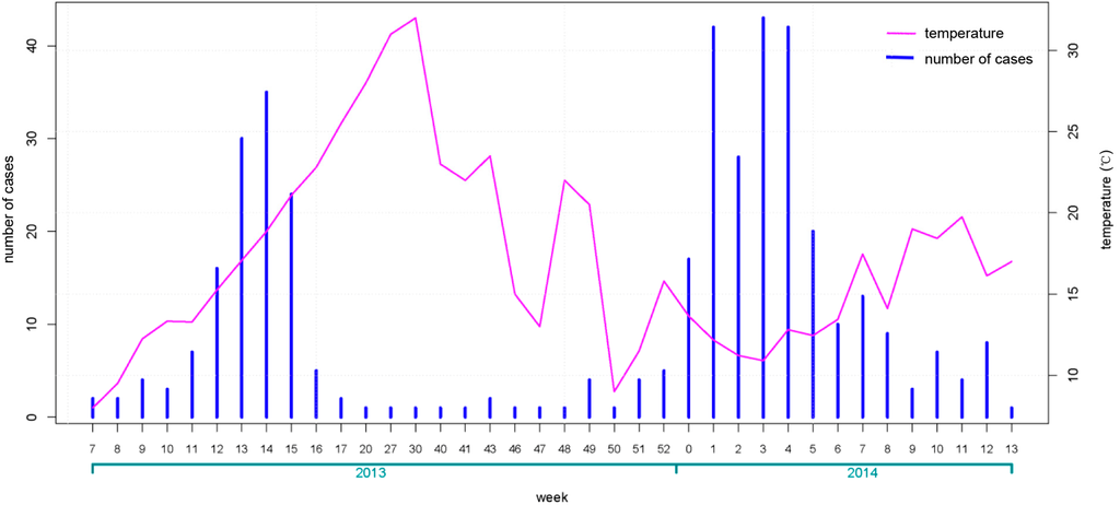 Weekly case number of human infection with avian influenza A (H7N9) virus and average weekly temperature.