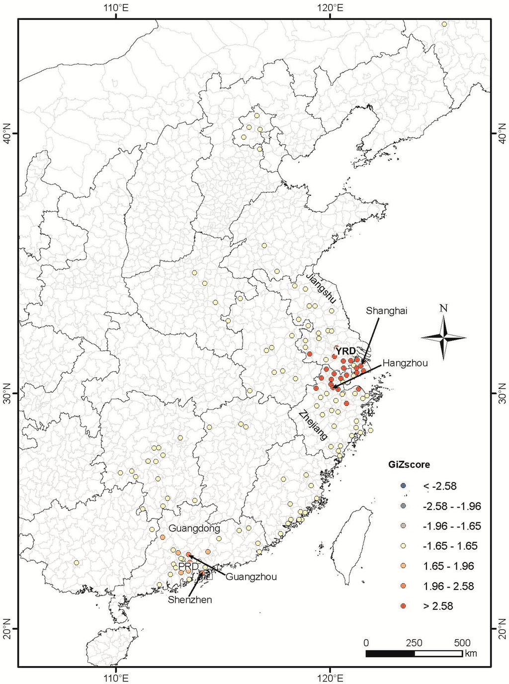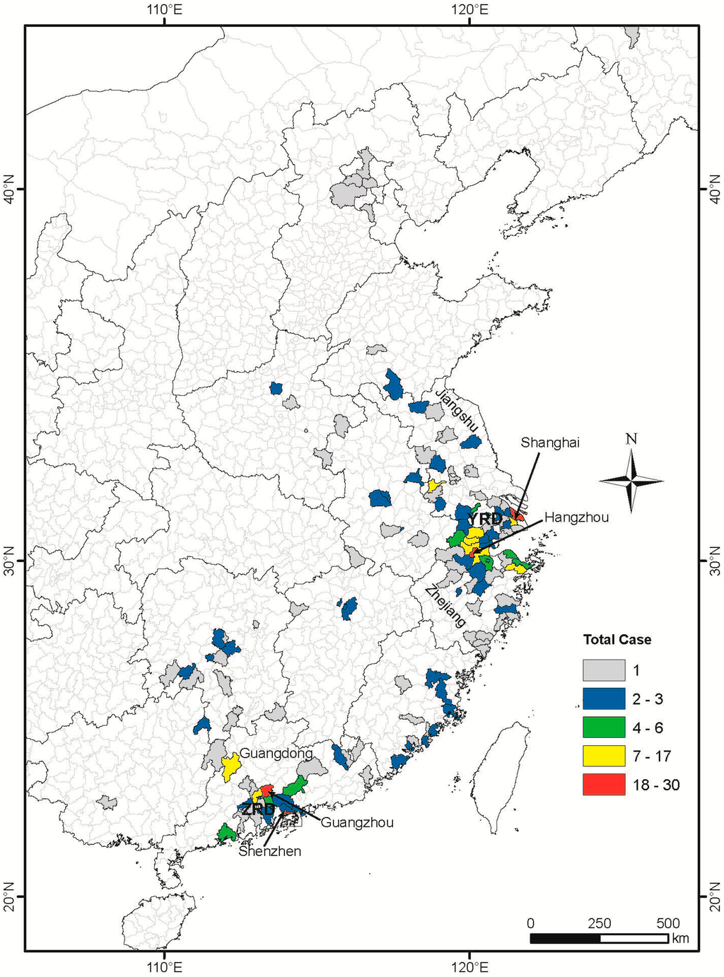 Distribution of H7N9 cases at county level in China from the 19 February 2013 to 31 March 2014. County and province boundary data was accessed from Chinese National Fundamental Geographic Information System (www.nfgis.nsdi.gov.cn) in May 2014. Provinces (Guangdong, Zhejiang and Jiangsu) and cities (Shenzhen, Guangzhou, Hangzhou and Shanghai) mentioned in the paper are marked out. YRD: Yangtze River delta, PRD: Pearl River delta.