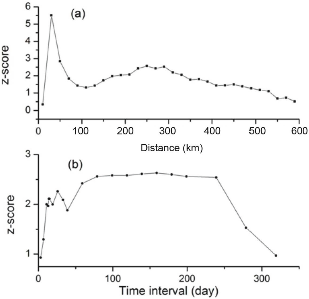The threshold spatial distance was defined by analyzing the spatial clustering of H7N9 cases, ignoring all temporal properties, using the Incremental Spatial Autocorrelation tool of ArcMap™. By investigating the statistically significant level of spatial clustering of H7N9 cases at the county level and by defining neighborhoods as ranging from 10 to 590 km at 20 km intervals, a peak significance level of clustering was found that may indicate the threshold distance where spatial clustering is most prominent. A spatial distance of 10 km ensures the closest features to be neighbors while a spatial distance beyond 590 km does not create additional statistically significant clustering.