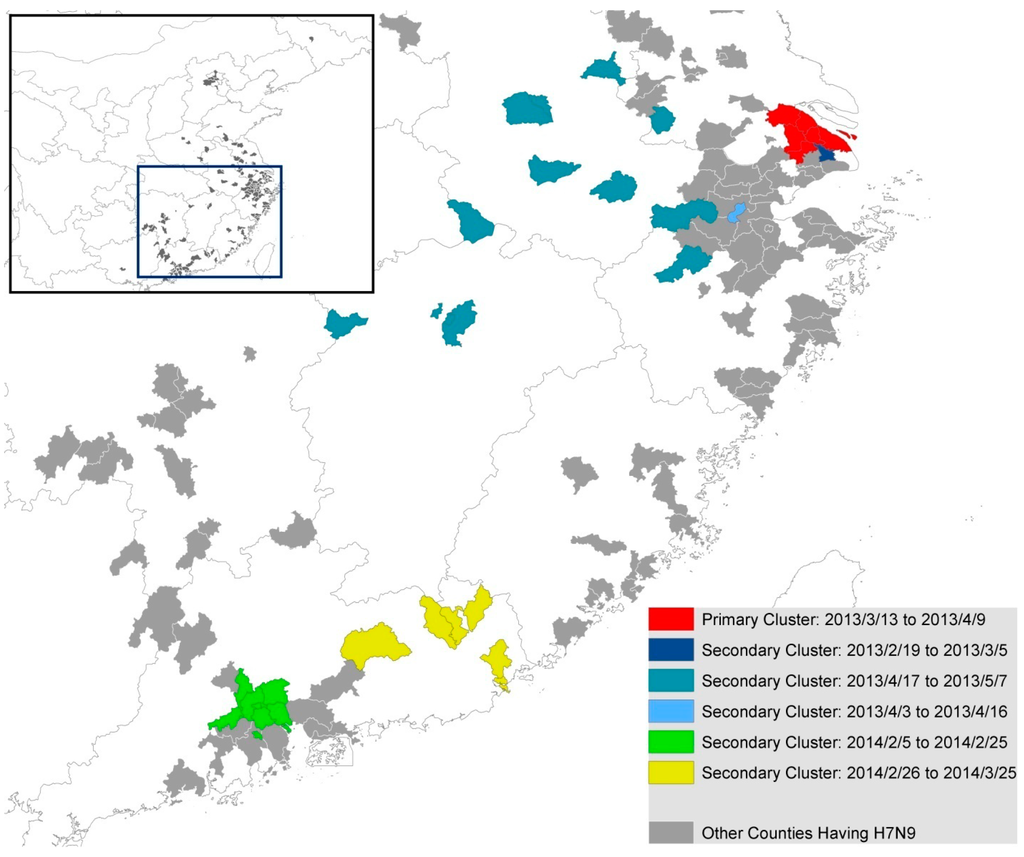The SatScan results also showed that there were six clusters during the whole period. The primary cluster occurred during 13 March 2013 to 9 April 2013, while three secondary clusters occurred during the period of 19 February to 5 March 2013, 3 April to 16 April 2013 and 17 April to 7 May 2013. The remaining two secondary clusters were detected in the year of 2014, from early February to late March (Figure 5). Most of the secondary clusters except those that occurred in Guangzhou and Shenzhen (Figure 2) were identified in counties with no more than three cases during the whole study period.