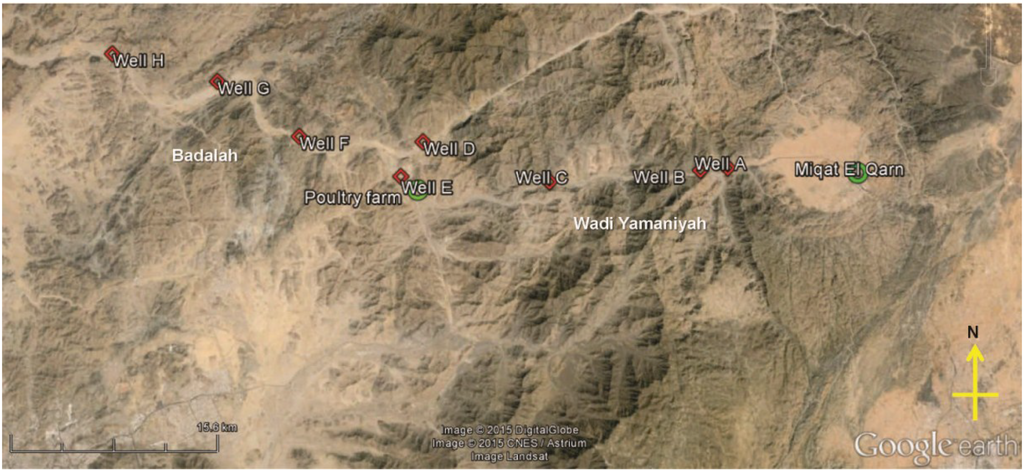 The study area is located in a narrow valley north of the city of Mecca, Saudi Arabia, with approximate GPS coordinates of 21.7° N, 40° E. Groundwater flows from the northwest direction from an area called Wadi Yamaniyah to Badalah. Two sampling trips were made, on 12 and 26 March 2014, to collect groundwater samples from eight different wells (Figure 1). For the first sampling trip, groundwater was collected from three wells, A, B and C, in Wadi Yamaniyah. All three wells are located downstream of a pilgrimage gathering venue called Miqat El Qarn (21.6° N, 40.4° E). For the second sampling trip, groundwater from wells A, B and C, as well as an additional five wells D through H were sampled downstream from a poultry farm in Badalah. Wells D and E were located approximately 6 and 1 km downstream, respectively, from the poultry farm. These groundwater samples can be categorized into two groups based on their proximity to the poultry farm. Group 1 comprised samples from wells A, B and H that were located > 20 km from the poultry farm. Group 2 comprised samples from wells C through G that were located < 20 km from the poultry farm. To collect groundwater samples, mechanical pumps were activated to pump up groundwater from a depth of approximately 0.3 km below the ground surface. The water was flushed for approximately 3 min prior to collection into sterile polyethylene bottles. A total of 5 L of groundwater was collected from each well. In addition, approximately 1 kg of both tomatoes and green peppers were sampled at sites that utilized groundwater from wells B and F for irrigation. All samples were placed into a cooler and kept cool during transport. Once at the laboratory, samples were stored at 4 °C for 1–2 days prior to analyses and preparation as detailed in subsequent Section 2.2 through Section 2.3.