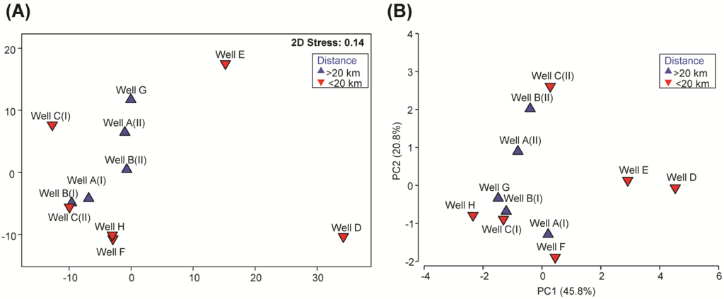 Clustering ordination analyses of groundwater wells A through H. (A) threshold metric dimensional scaling plot of groundwater microbial communities, (B) principal component analysis of water quality data. Data collated include the abundance of human-associated Bacteroides, 16S rRNA gene copy number, total cells, coliform density, total nitrogen and total organic carbon content.
