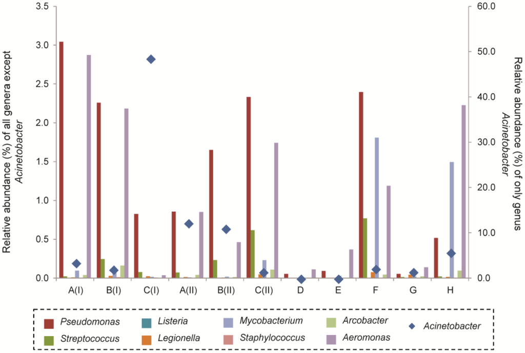 Relative abundance of genera associated with opportunistic pathogens in the groundwater collected from respective wells A through H. The relative abundance was compared to the total groundwater microbial community analyzed using high-throughput sequencing.