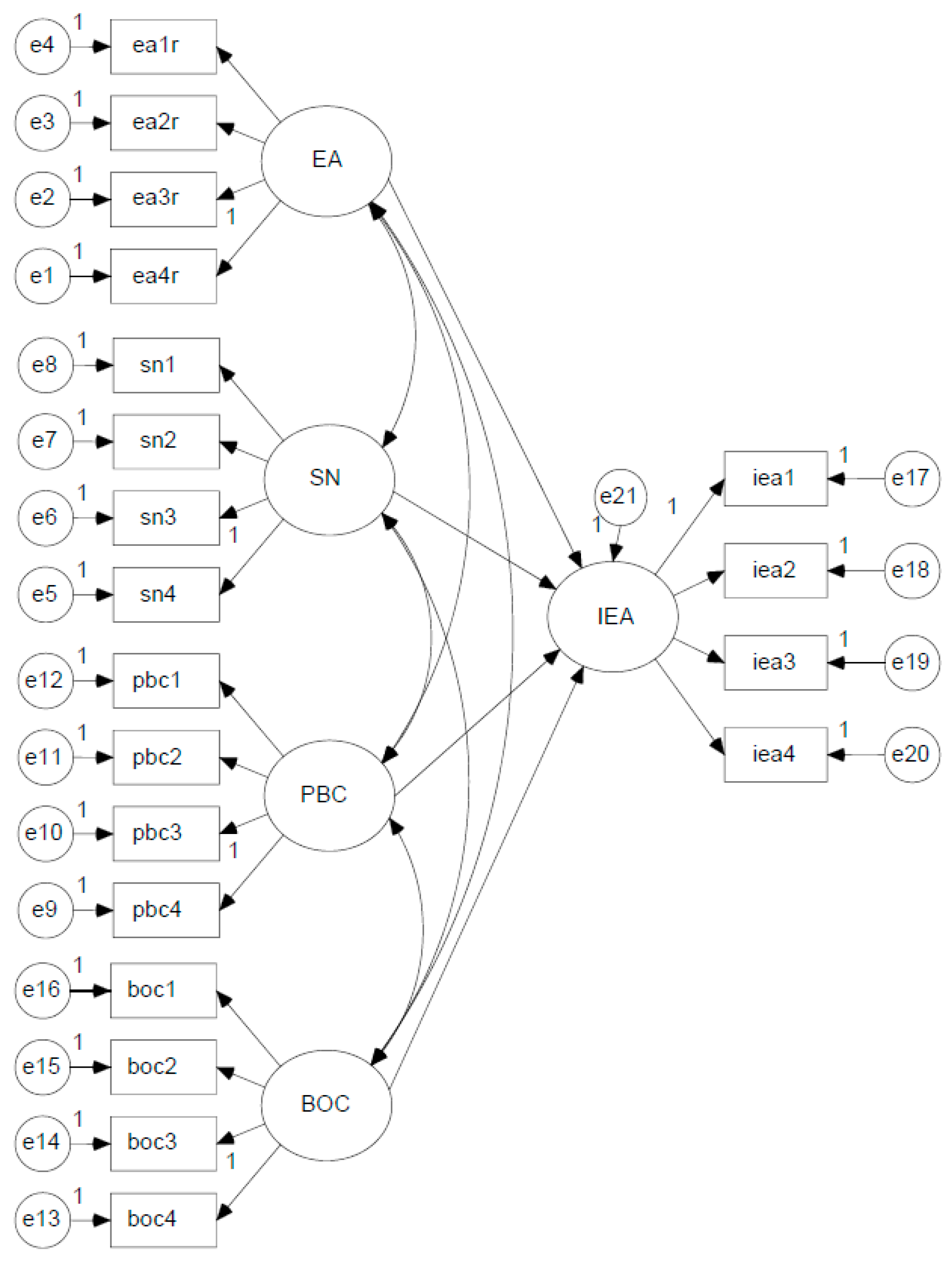 The Cronbach’s alpha for each construct in the ECC model was above 0.7, which complies with the suggestion of Hair et al. [53] and indicates acceptable reliability. All constructs showed acceptable consistency: EA (0.927), SN (0.897), PBC (0.920), BOC (0.922), and IEA (0.924).