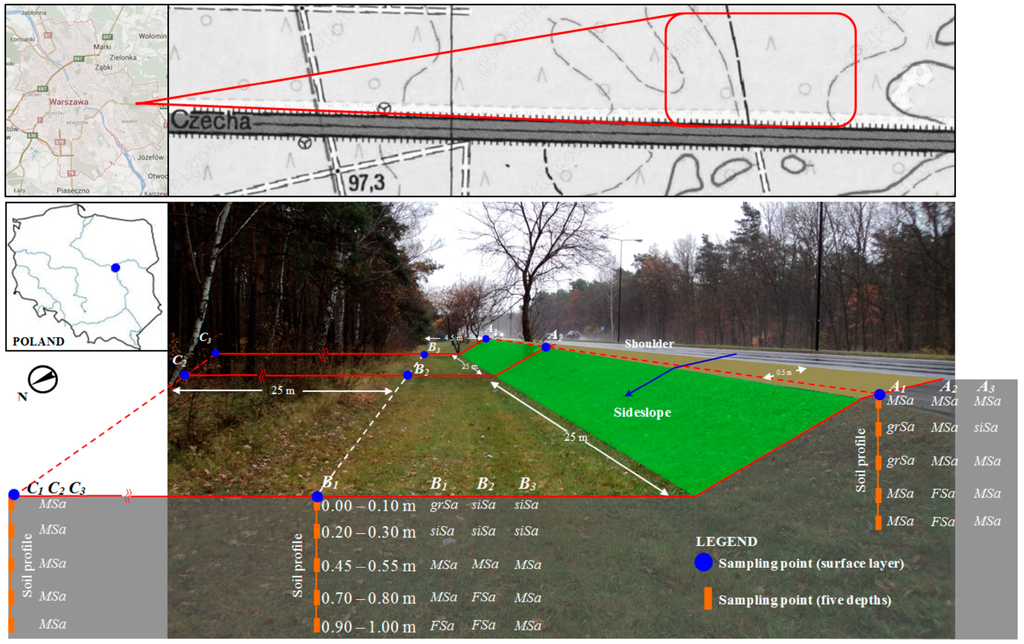 The study site was a stretch of a national road regarded as the most important European transportation route on the east-west axis and the main route taken by large trucks transporting goods from Western Europe to Russia and Belarus. The sampling locations (Figure 1) were located along expressway E30, which cuts through the ecologically valuable terrain of the Mazowiecki Natural Landscape Park, Central Poland (52°3′32″ north altitude and 21°10′5″ east longitude). The protected area was established in 1986 and covers an area of 143.7 km2. The expressway has two lays going in each direction, each of which is 4 m in width, and the surfaces are asphalt concrete pavement, average daily traffic (veh/day) 53,998. The speed of the vehicles was 50–90 km·h−1. Most of the vehicles running on this road use fossil fuel i.e., diesel, gasoline, and natural gas. The road was constructed on the embankment of 1.4 m height filled with medium sand grained material. Material extracted from Section B and C (medium and fine sands) was natural soil, while material in embankment (Section A) was brought from other area and filled with compaction. On the analyzed stretch of road, runoff directly infiltrates into the adjacent soil. The surrounding land use is a mixed pine-oak forest, which starts approximately 5 m from the edge of the road. Poland is located in the temperate warm transitional zone, forming under the influence of different air masses clashing over its territory. The average annual precipitation in Poland is around 628 mm, but in the mountainous areas it exceeds 1100 to 1400 mm. Most rainy season falls between in May, June, July and August.