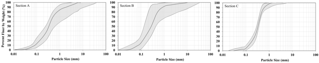 Ranges of particle size variability in the analyzed Sections (A–C).