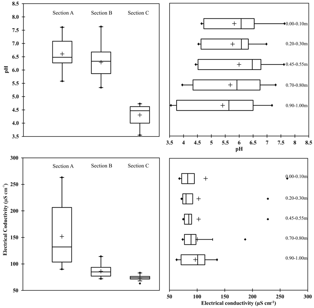Boxplots showing the median, quartiles, and minimum and maximum values of the pH and electrical conductivity (EC) with the depth and distance values from the road.