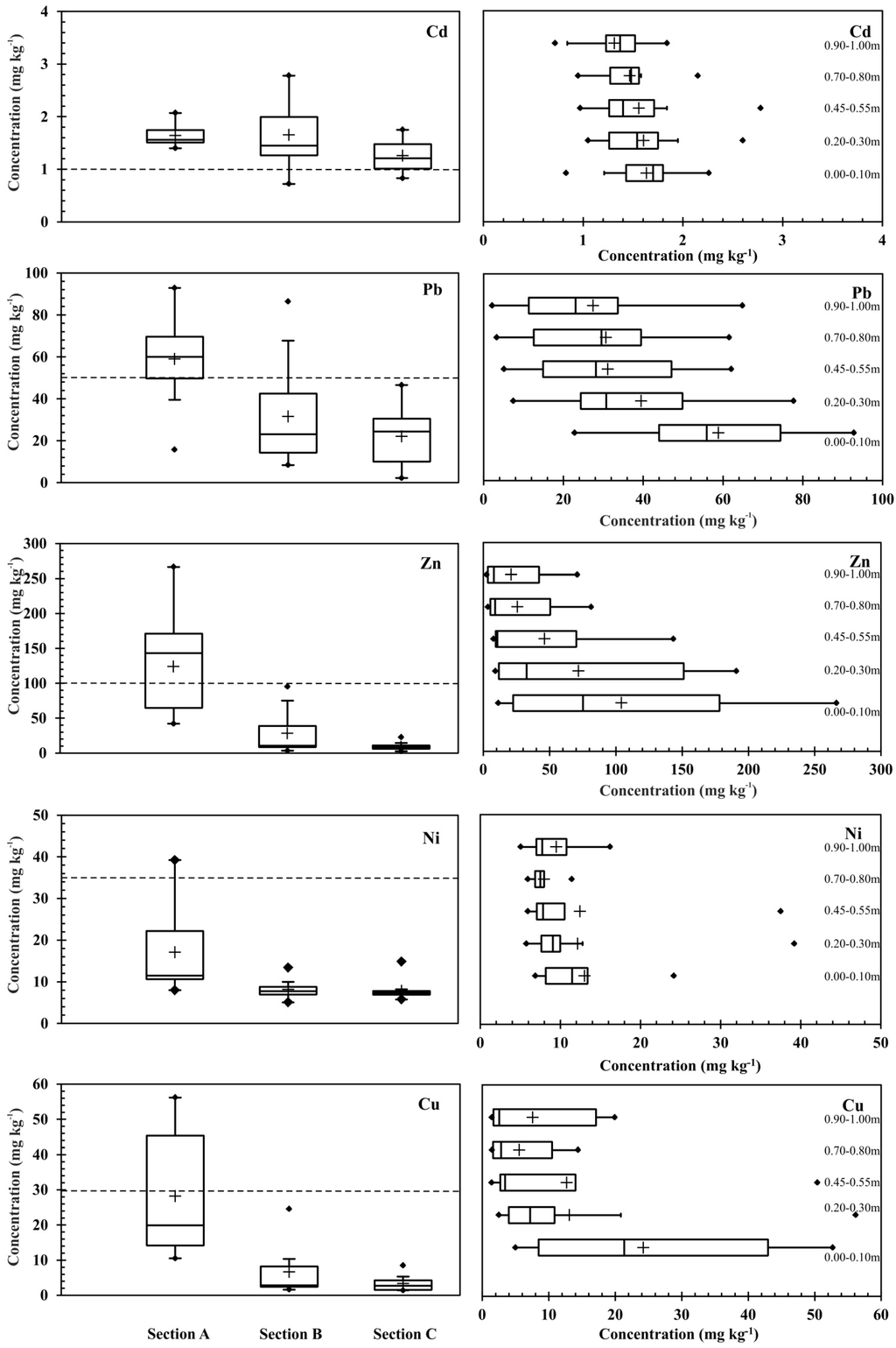 | Section | Zn | Pb | Cd | Ni | Cu | Zn | Pb | Cd | Ni | Cu |