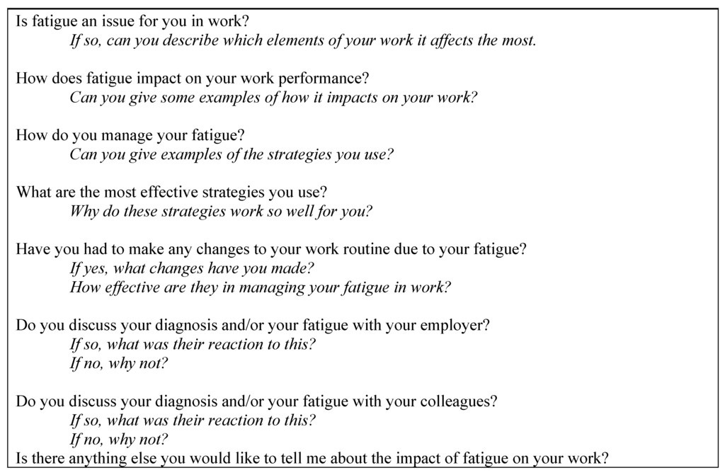 Interviews were carried out over a four-month period by one researcher (CF) in a quiet room in the university where the study was carried out. A semi-structured interview guide (Figure 1) was used to focus the discussion so that it was in line with the study aims while also seeking people’s personal experiences [18]. Probe questions were used to gather more specific details on the impact of fatigue in the workplace (Figure 1). The interview guide was posted or emailed to participants before the interview to enable them to prepare for their interview. Interviews lasted between 15 and 70 min.