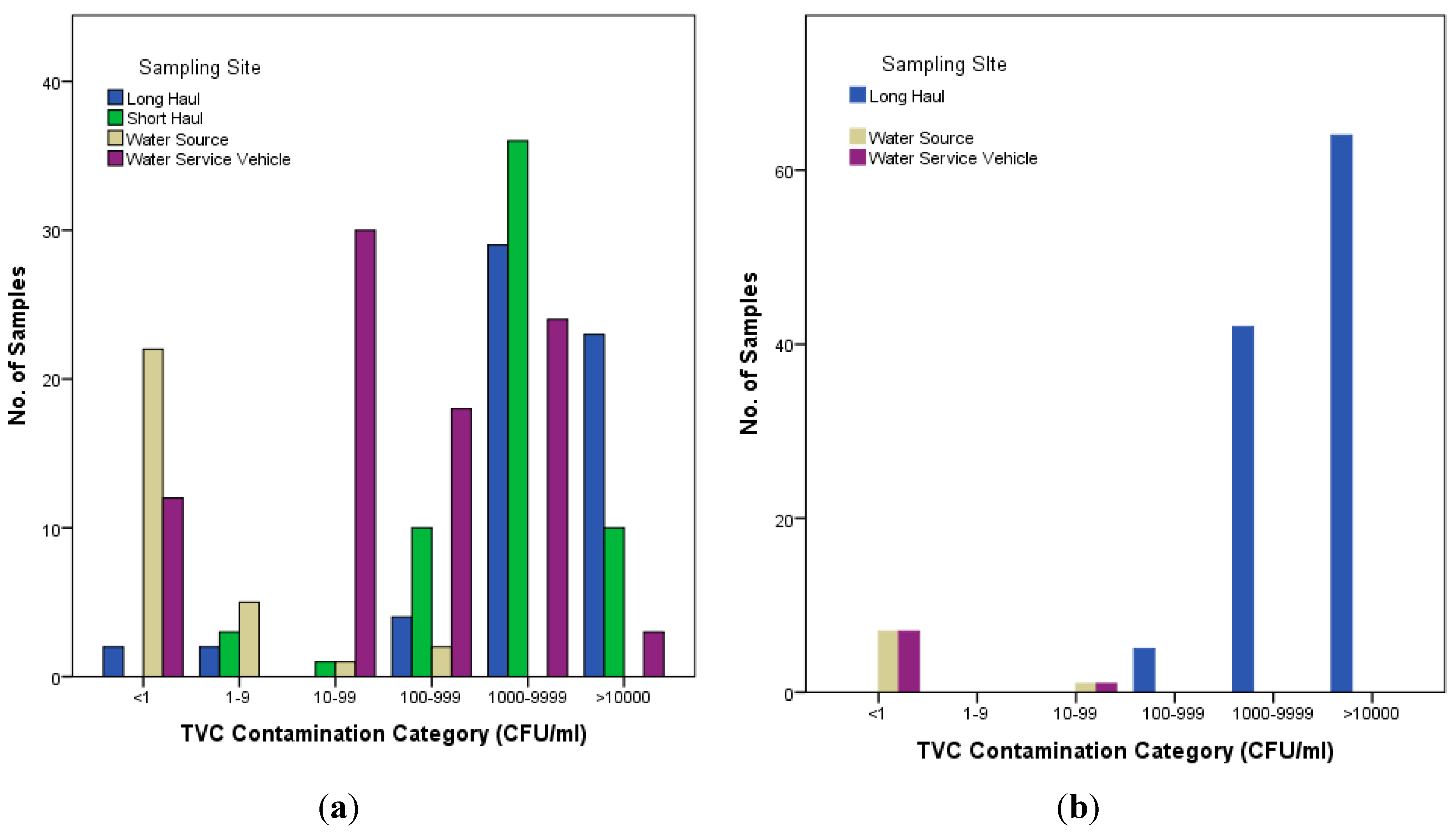 For the aircraft, both long- and short-haul across both sampling activities, we see a shift in category distribution towards the higher TVCs. For sampling activity A, 29 and 36 samples fall into the 1000–9999 cfu/mL category for long-haul and short-haul aircraft respectively. In sampling activity B, of the samples tested 64 were in the >10,000 cfu/mL range. These results demonstrate that aircraft water supply tanks are conducive for microbial growth.