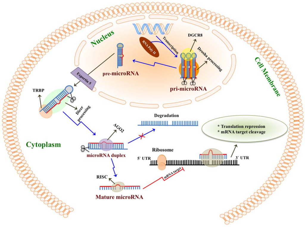 Since their recent discovery in 1993, microRNAs (also known as miRNAs) have emerged as key regulators of gene expression at the post-transcriptional level in humans, animals and plants [1,2]. They act by binding to an mRNA target to either inhibit the translation of mRNA into protein and/or promote its degradation [3,4,5]. The microRNA family includes extremely small non-coding RNA (~22 nucleotide in length) that have been isolated from cells, tissues and body fluids of various mammalian species [6,7]. The biogenesis of microRNA comprises three main processes [8]: microRNAs are first transcribed into primary microRNA (pri-microRNA) from specific independent genes on DNA by RNA polymerase II, and are then converted into hairpin precursor microRNA (pre-microRNA) by the Drosha–DGCR8 complex. The enzyme Dicer then produces mature microRNA from pre-microRNA in the cytoplasm (Figure 1) [7,9]. According to miRBase version 21.0 (http://www.mirbase.org) released in June 2014, the number of pre-microRNAs in the human is estimated to be 1881. These correspond to 2588 known mature microRNAs, while the number of human protein-coding genes that are considered to be targets of microRNAs is estimated to be approximately 20,000–25,000 [10]. Therefore, a single mature microRNA can bind and regulate multiple mRNAs (genes) [6]. Importantly, ongoing research is still discovering new microRNAs.