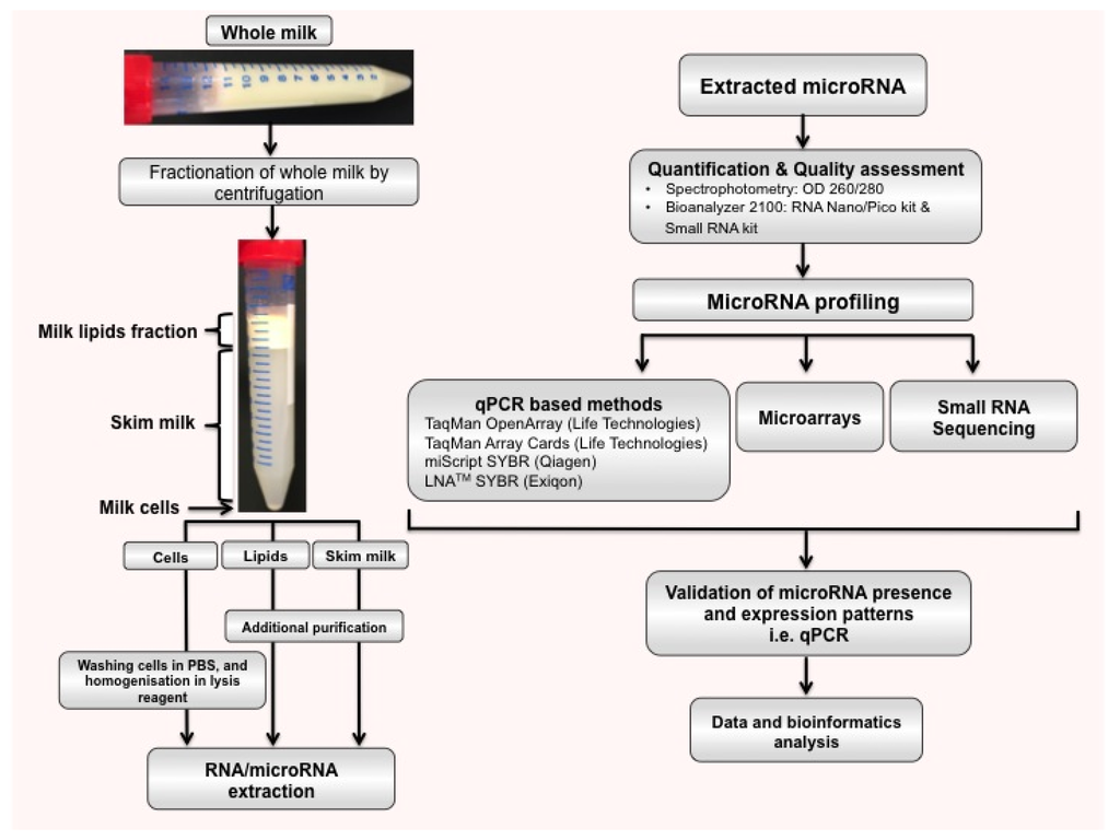 A workflow of microRNA identification in HM. Whole HM can be fractionated by centrifugation for 20 min at 800 g at 20 °C to obtain three fractions including the cells, the lipid layer and skim milk. Total RNA and microRNA can be extracted from each fraction using the optimal kit [47]. Profiling of microRNA after quantification and measurement of its quality can be performed using three different methods [47]: phenol/guanidine, filter column, and a combination of the filter column and phenol/guanidine methods. Small RNA sequencing can determine novel microRNAs and identify all microRNAs in a sample. Microarray analysis and qPCR-based methods can on principle only measure specific microRNAs. Validation of presence and expression patterns of a microRNA of interest is done using qPCR as it is highly sensitive and specific.