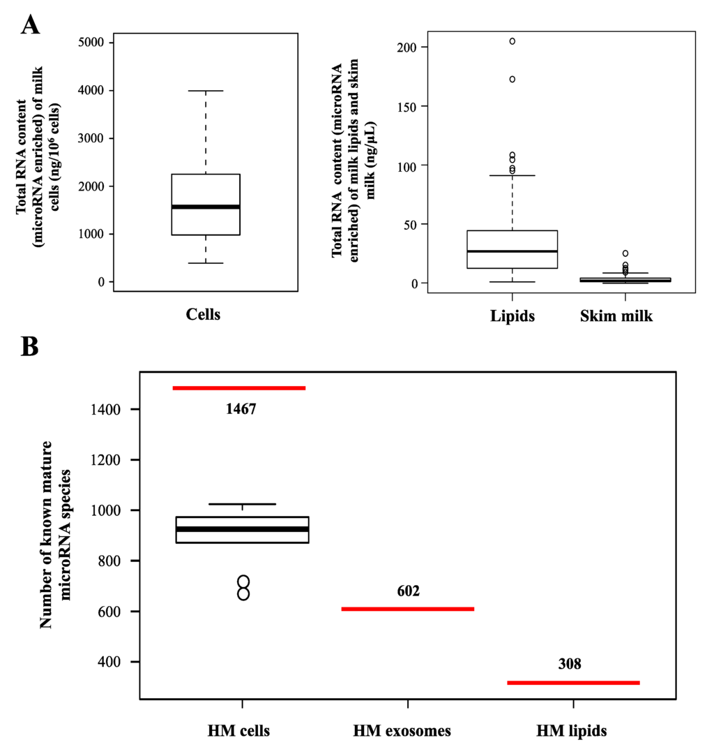 Differences in the microRNA content between the different fractions of human milk. (A) Box plots showing the total RNA content (enriched in microRNA) measured using NanoDrop 2000 in HM cells (n = 30 milk samples from 20 mothers), lipids (n = 127 milk samples from 79 mothers) and skim milk (n = 116 milk samples from 79 mothers) obtained from healthy breastfeeding mothers [35,45,47]. (B) Box plot showing the number of mature microRNA species that have been identified in HM cells, lipids and exosomes using deep small RNA sequencing. HM cell microRNAs were profiled in n = 20 samples collected from 10 healthy exclusively breastfeeding mothers in month 2 of lactation [35] using Illumina HiSeq2000, with total clean reads of 268,681,616 matched to miRBase version 20.0. This study identified 1467 different mature known microRNAs in HM cells. HM lipid samples (n = 7) were sequenced using an Illumina 1G Genome analyzer, with 124,110,646 clean reads mapped to miRBase version 16.0. This study identified 308 mature known microRNAs in HM lipids [44]. HM exosome samples (n = 4) were sequenced using an Illumina Genome analyzer II, with 83,520,000 clean reads matched to miRBase version 17.0. This study identified 602 mature known microRNAs in HM exosomes [36].