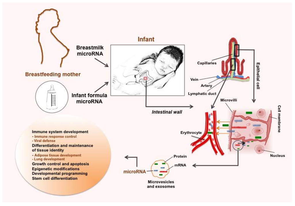 A potential scenario depicting the sources of exogenous microRNA for the infant (breastmilk and infant formulae) and uptake of them along with other macro/micronutrients (i.e., fatty acids and amino acids) in the infant’s gastrointestinal (GI) tract. Breastmilk microRNAs can be delivered to the infant either as free molecules in skim milk, or via uptake of breastmilk cells, exosomes and other milk microvesicles in the GI tract. There, absorption is thought to occur through intestinal epithelial cells, from which milk-derived microRNA may reach various organs and tissues via the bloodstream to potentially perform functions, such as immunoprotection and developmental programming. It is of note that infant formulae are extremely poor in microRNA compared to HM, with potential differences also in the biological activity of these molecules in formula that merit further investigation.