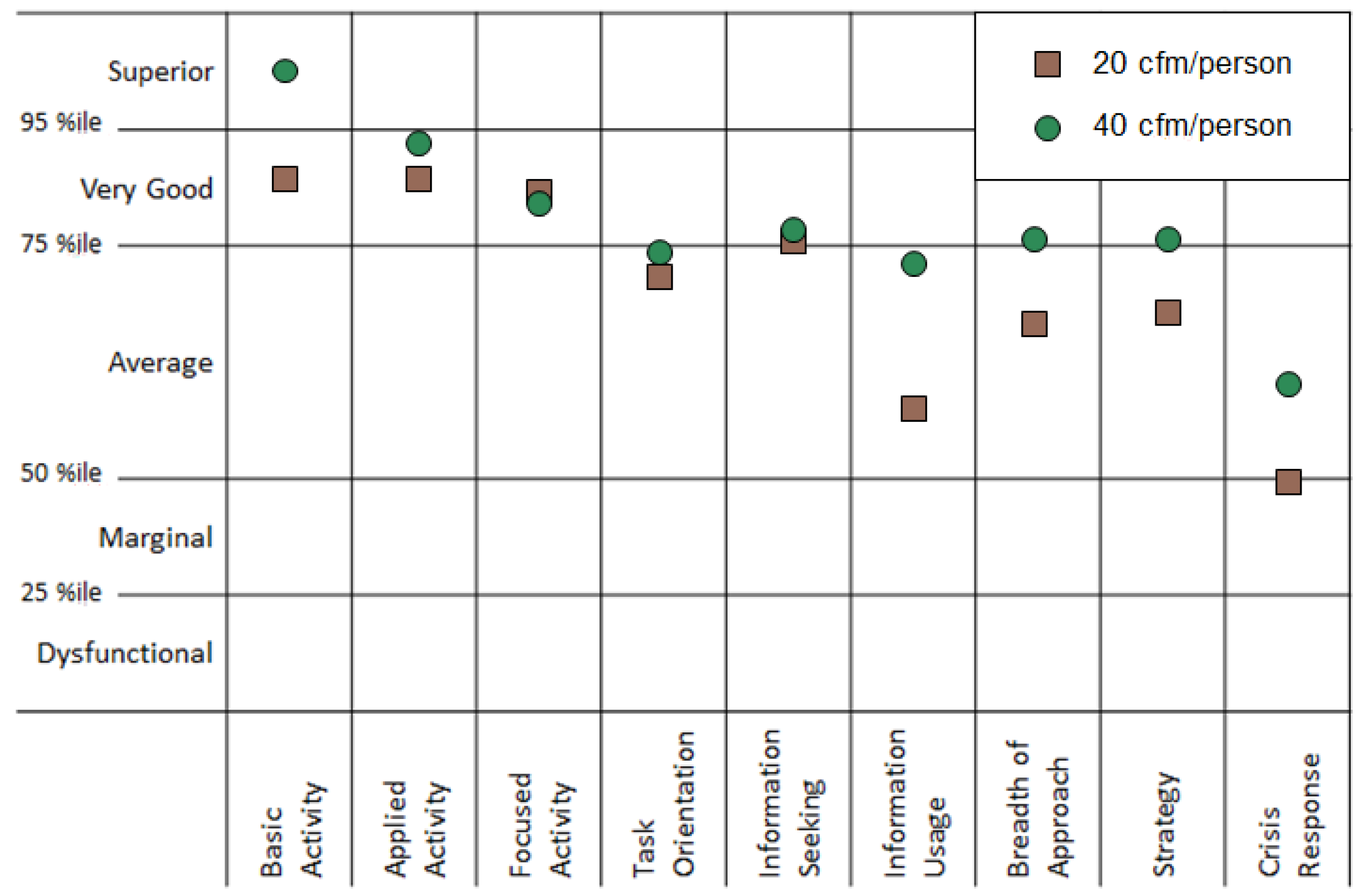 In a previous study of ventilation and cognitive function by our study team, 24 participants were exposed to 20 and 40 cfm of outdoor air per person on different study days [15]. At the end of each study day, they completed the Strategic Management Simulation (SMS) cognitive test, which measures decision-making performance across nine domains: basic, applied and focused activity level, task orientation, crisis response, information seeking and usage, breadth of approach and strategy. In this current paper, we used the participants’ scores from our previous study and plotted them against normative data of 70,000 previous SMS test takers to see the percentile shift from one ventilation condition to the next (Figure 1).