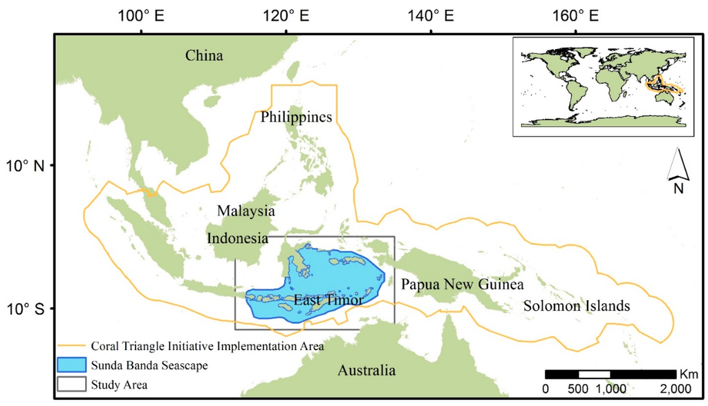 The Sunda-Banda Seascape (SBS) study area is located in the central portion of the Coral Triangle in eastern Indonesia (Figure 1). Sunda Banda refers to a geological and geographical area of the landscape covering the marine area and islands from Bali in the southwest to Maluku in the northeast.