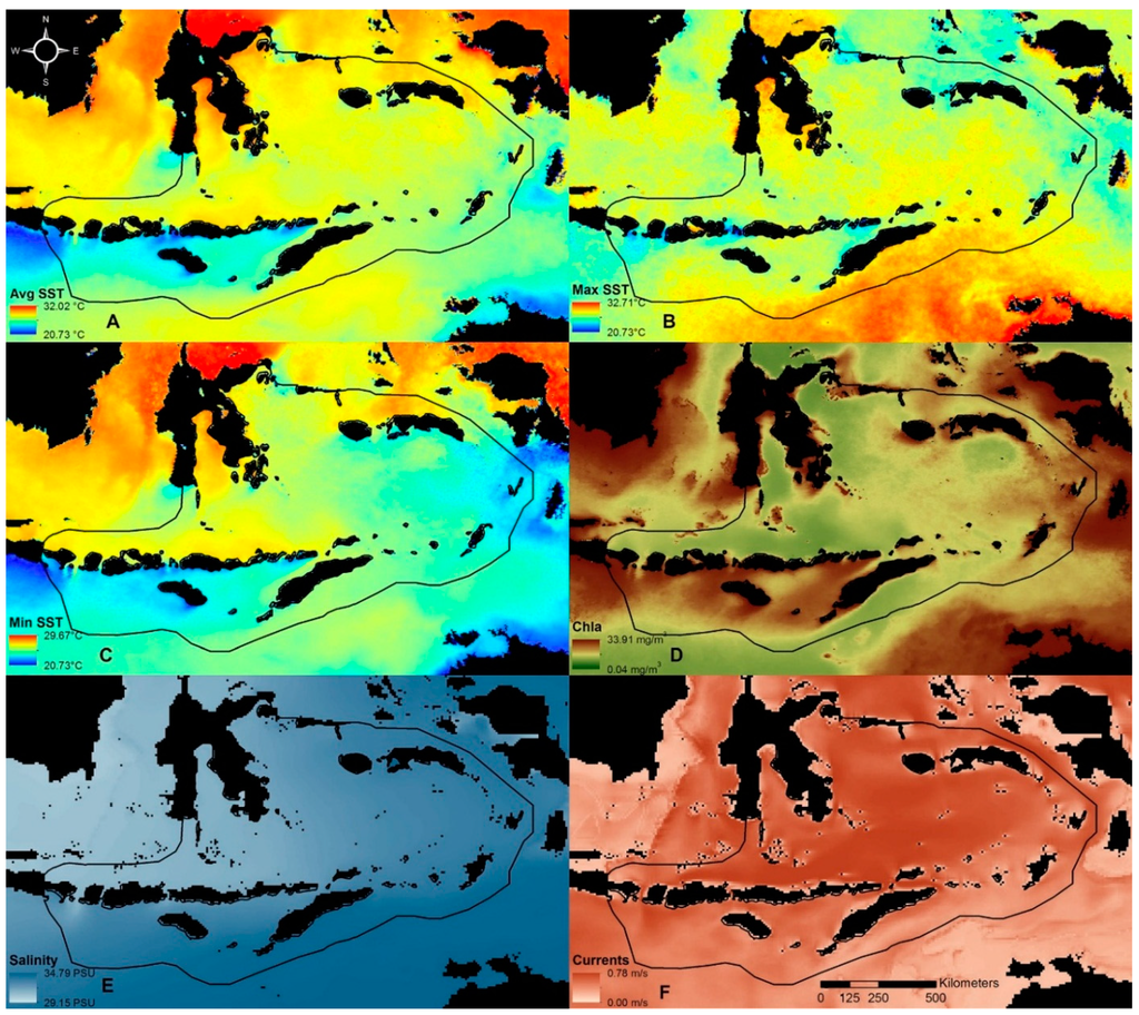 Input variables for classifying the Sunda Banda Seascape into biophysical regions. (A) Average sea surface temperature (Avg SST); (B) maximum monthly climatological sea surface temperature (Max SST); (C) minimum monthly climatological sea surface temperature (Min SST); (D) average chlorophyll a concentration (Chla); (E) sea salinity (Salinity); (F) average ocean current speed (Currents).