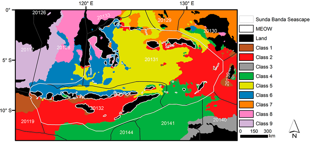 Biophysical region classification of the Sunda Banda Seascape with 9 classes. MEOW denotes Marine Ecoregions of the World [16]. Five-digit codes refer to marine ecoregions: 20126—Palawan/North Borneo; 20117—Sunda Shelf/Java Sea; 20119—Southern Java; 20128—Sulawesi Sea/Makassar Strait; 20133—Northeast Sulawesi; 20131—Banda Sea; 20132—Lesser Sunda; 20144—Exmouth to Broome; 20129—Halmahera; 20141—Bonaparte Coast; 20130—Papua; 20139—Arafura Sea; 20140—Arnhem Coast to Gulf of Carpenteria.