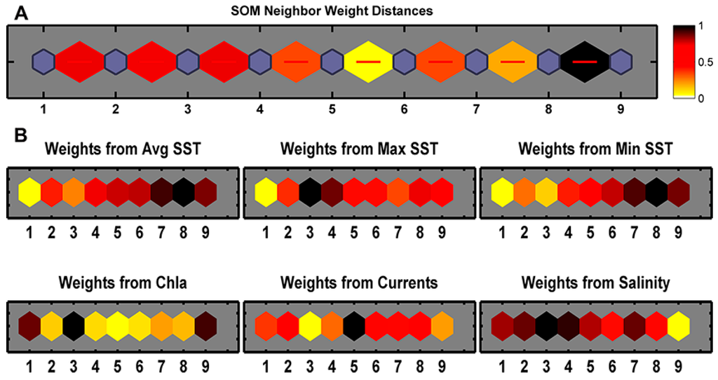 The classification approach selected for this research, Self-Organizing Map (SOM), is a flexible, unsupervised neural network for data analysis and clustering [22,23,24]. Several performance studies have illustrated the advantages of SOM over other clustering methods, such as k-means, fuzzy k-mean and ISODATA [25,26]. SOM is more appropriate for large, nonlinear data sets with high dimensionality [25,26], and draws great attention in geographic information science [27] for spatial and temporal modeling and analysis [25,28,29,30,31,32,33]. In the field of marine science, there are few examples in the literature of SOM applications for the extraction of spatial patterns and classification of environmental regions. There are relatively few studies using SOM in marine environments but include (for example) the Atlantic Ocean [34] and Caribbean Sea regions [5].