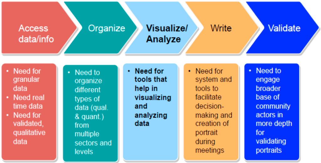 In our study, we focused on three local-level processes. First, at a fundamental level, stakeholders from diverse types of organizations congregate in multiple MSP meetings to engage in decision-making for developing their community epidemiological profiles, bringing diverse worldviews and perspectives that were evident in their divergent views on what healthy eating and physical activity issues, related to childhood obesity, should be prioritized. We identified a sub-process of five steps over the course of MSP meetings that constitute the development of epidemiological profiles: (i) accessing and selecting data sources and information deemed by community networks and QEF as pertinent to healthy eating and physical activity in the community; (ii) organizing the data and information (i.e., mostly summaries or notes from the studies/reports reviewed); (iii) visualizing and analyzing the data and information; (iv) developing epidemiological profile documents; and (v) engaging stakeholders for validating epidemiological profile documents. Figure 1 below summarizes the sub-processes and needs identified from our analysis.