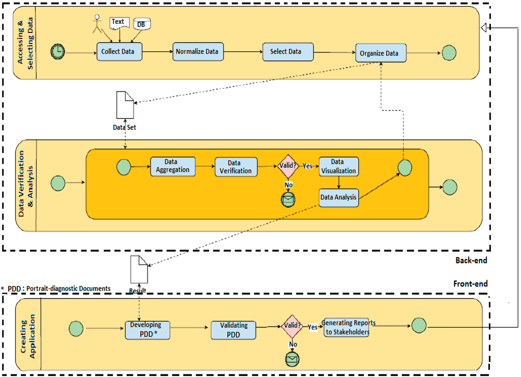 In a second set of processes after the list of the organized data is created, (a) the data undergoes aggregation, followed by (b) verification. If the data is found not to be valid, it is communicated to experts for correction. Verified data is then (c) visualized and then (d) analyzed by experts, with the output being results of the analyses that are generated for creating a user-friendly application.