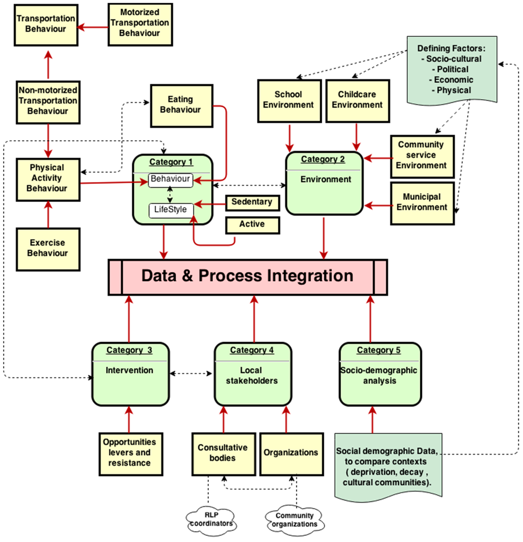 Studying the development of epidemiological profiles, and community mobilization to prevent childhood obesity highlighted complex links between processes and outcomes at multiple levels, and across sectors. Thus, mapping processes and concepts enables decision-makers to more easily visualize linkages between determinant of physical activity and eating behaviors, and outcomes such as health (e.g., obesity), educational (e.g., school drop-out), and economic (e.g., cost burden due to obesity-related health problems, or drop-outs).