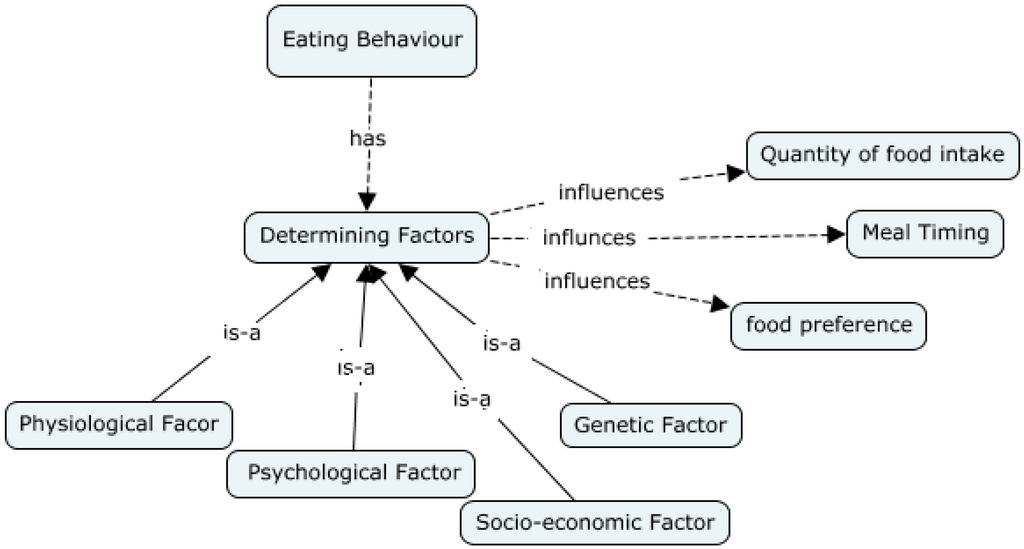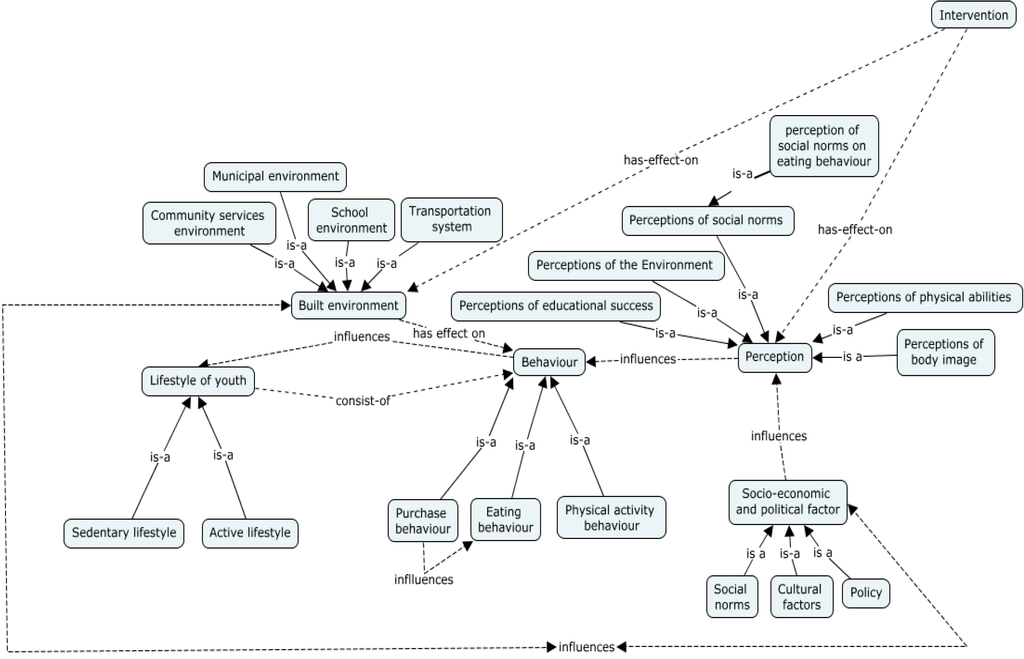 Figure 5 and Figure 6 below, present examples or concept maps, in different level of granularities, developed regarding the relationship between Behavior, in general, with other factors, as well as the interactions between different determinants of Eating Behavior with other parameters. We note that Perceptions (a concept) influence Behaviors (another concept), such as Eating Behaviors. Perceptions include Perceptions of Social Norms, which can be further specified into Perceptions of Social Norms on eating behavior (i.e., perceptions of social norm among a population of children in which healthy eating is not “cool”). Perceptions themselves are associated with a Population, which has Socio-cultural characteristics. The Built Environment, including Schooling, Childcare, Community Service, and Municipal Environments also have an effect on Behavior. We also note that there are some relationships between types of behaviors, for example with eating behaviour being influenced by purchasing behaviours.