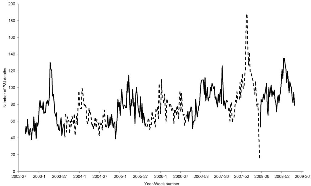 Number of P&I deaths from 2002 to 2009 in Hong Kong. The alternating solid and dashed line separates the yearly data.