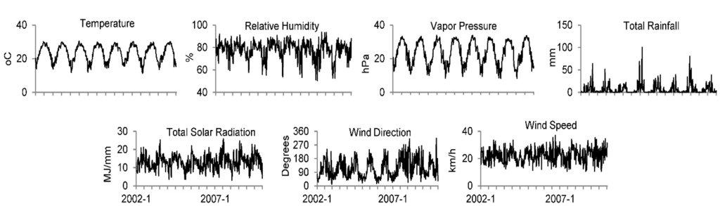 The weekly average of meteorological parameters: air temperature, relative humidity, total rainfall, total solar radiation, wind direction, and wind speed from 2002 to 2009 were collected from the Hong Kong Observatory. The time series of the data is shown in Figure 2. Actual vapor pressure (e) was calculated as a metric for absolute humidity by the Teten’s formula [12,13]: