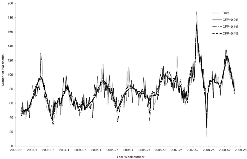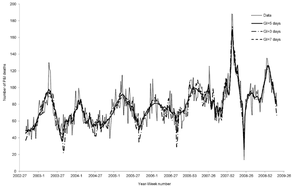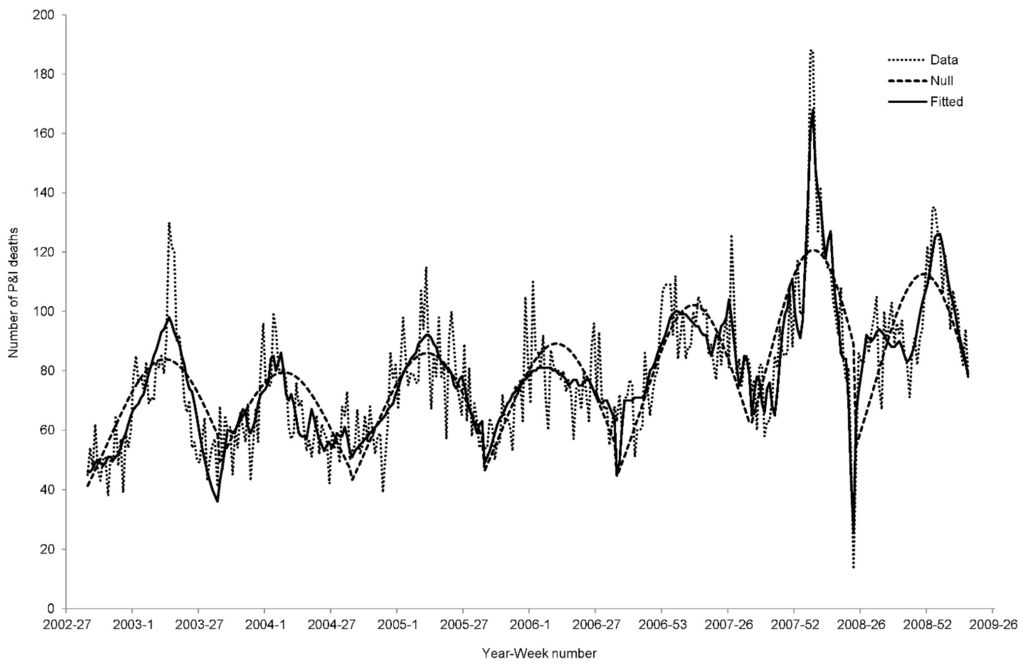 Data on deaths from P&I from 2002 to 2009 in Hong Kong were obtained from the Hong Kong Census and Statistics Department (Figure 1). The mid-year population (Nyear) from 2002 to 2008 was collected from the Hong Kong Census and Statistics Department [11]. We separated each wave of P&I deaths by year from week 35 to week 34 of the following year. As the wave of 2007 was stopped earlier, it would start from week 35 until week 23 of 2008. The 2008 wave is from week 24 to week 16 of 2009, in order to prevent the overlap of cases after the outbreak of the 2009 H1N1 pandemic.