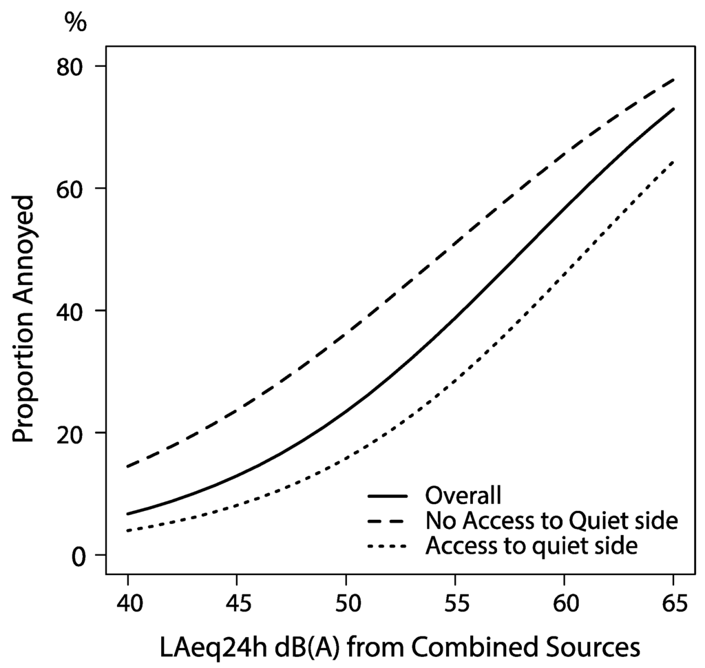 - De Kluizenaar, Y.; Janssen, S.A.; Vos, H.; Salomons, E.M.; Zhou, H.; van den Berg, F. Road traffic noise and annoyance: A quantification of the effect of quiet side exposure at dwellings. Int. J. Environ. Res. Public Health 2013, 10, 2258–2270. [Google Scholar] [CrossRef] [PubMed]