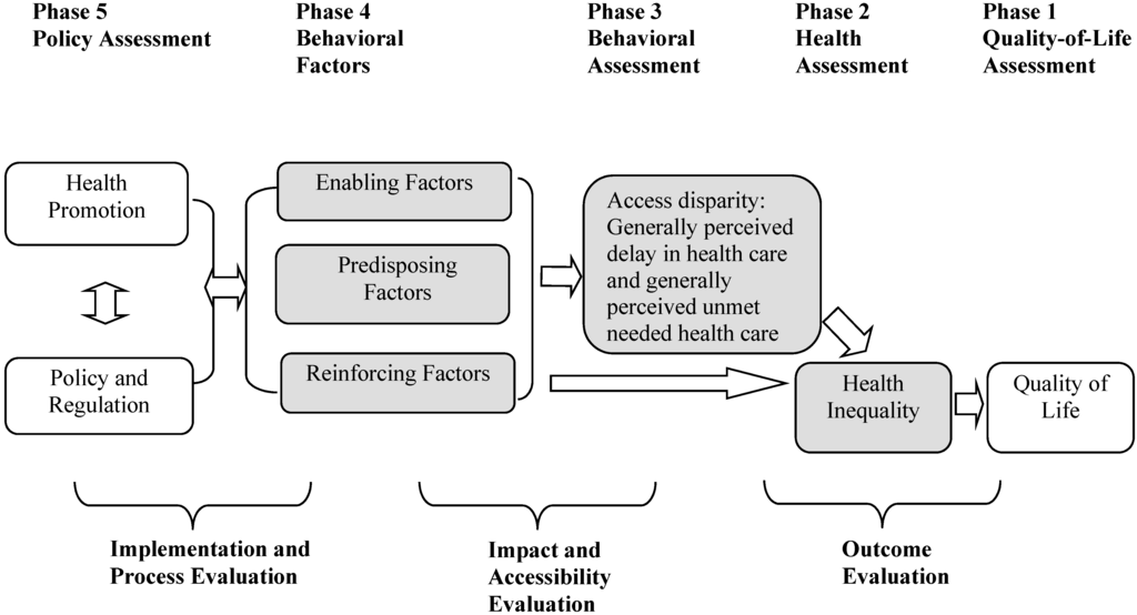 The line of research on health behavior and its policy implications originated from the PRECEDE-PROCEED model (PP model) [29,30,31]. This offers some concepts and analytical tools to help analyze access disparity and health inequality by using the U.S. Household Survey of the Community Tracking Study. The study applies the PP model to evaluate behavioral characteristics for delayed care, unmet needs, and health inequality between Phases 2 and 4 (Figure 2). Phases 1–5 show the assessment of the PP model in Figure 2. The focus of this study is to assess three categories of influential behavioral factors (enabling, predisposing, and reinforcing factors) by controlling socio-demographic factors in Phase 4 and by evaluating their behavioral influences on delayed care and unmet needs in Phase 3. Phase 5, the policy assessment section, represents the assessment of health promotion, and government policy and regulation on healthcare financing and delivery.
