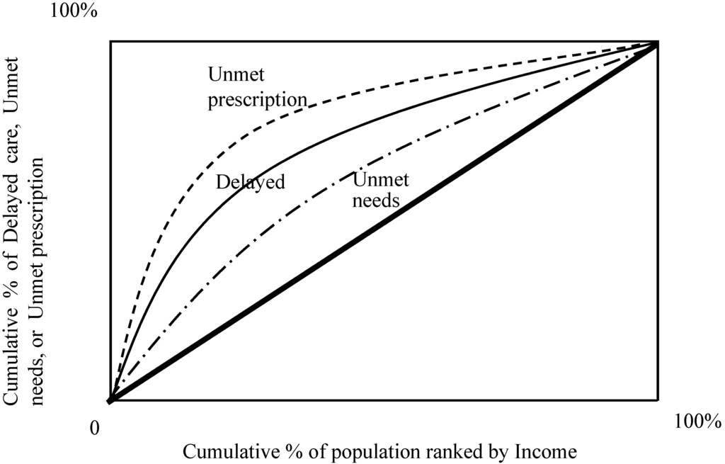 Concentration curves—Access Disparity (Income): Generally perceived delay in healthcare (Delayed care), Generally perceived unmet needed health care (Unmet needs), and Unmet needed prescription drug (Unmet prescription).