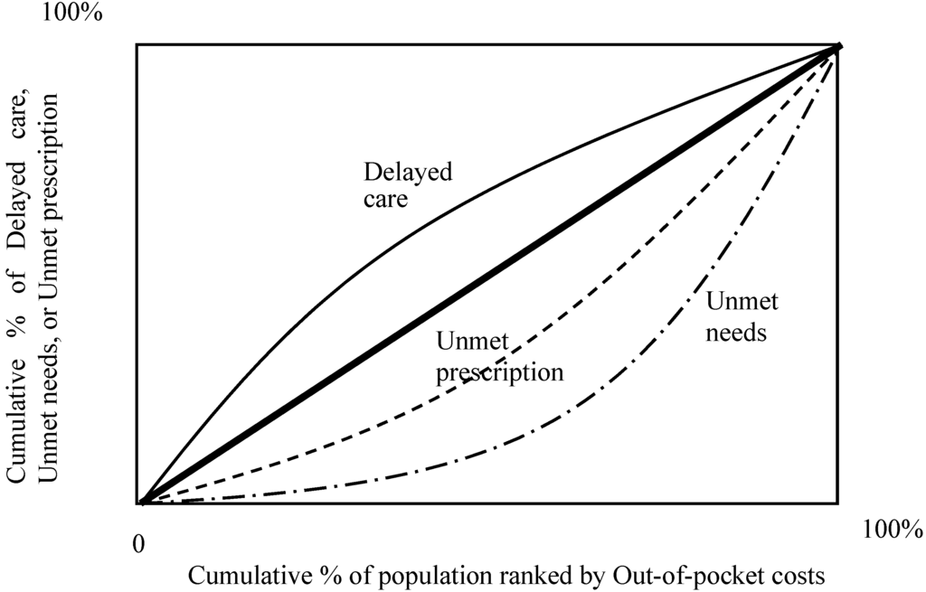 Concentration curves—Access Disparity (Out of Pocket): Generally perceived delay in healthcare (Delayed care), Generally perceived unmet needed health care (Unmet needs), and Unmet needed prescription drug (Unmet prescription) by Out-of-pocket costs.
