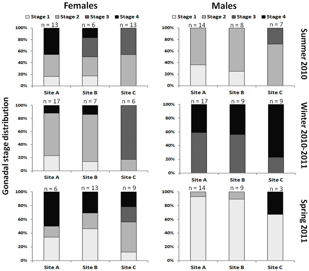 Distribution of the gonadal development stages in female and male mullets sampled in Summer 2010, Winter 2010–2011 and Spring 2011 from the Tiber river site A and B, and from the uncontaminated reference site C. In female mullets: stage 1 = primary oocytes, stage 2 = pre-vitellogenic oocytes, stage 3 = secondary oocytes and stage 4 = degenerated oocytes. In male mullets: stage 1 = spermatogonia, stage 2 = spermatocytes, stage 3 = spermatids and stage 4 = spermatozoids.