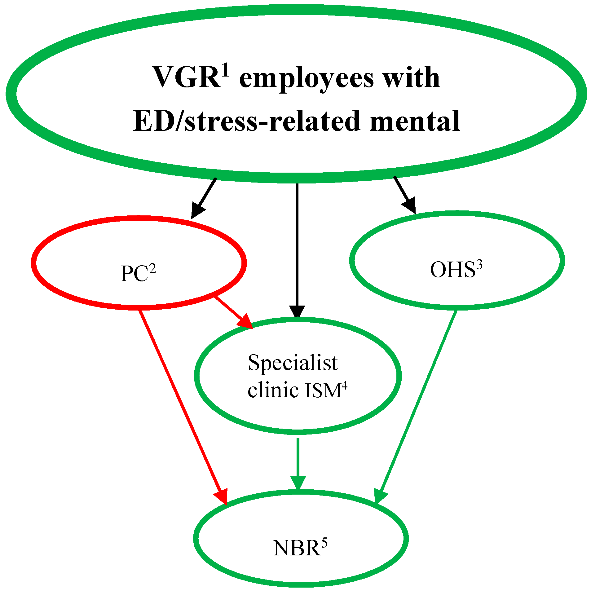 Referral to the NBR of patients with stress-related mental disorders. Green lines indicate activities directly within VGR1. Notes: VGR1= Region Västra Götaland; PC2 = Primary care service; OHS3= the VGR Occupational health service; ISM4 = Institute of Stress Medicine, VGR.; NBR5 = the Nature-Based Rehabilitation started by VGR.