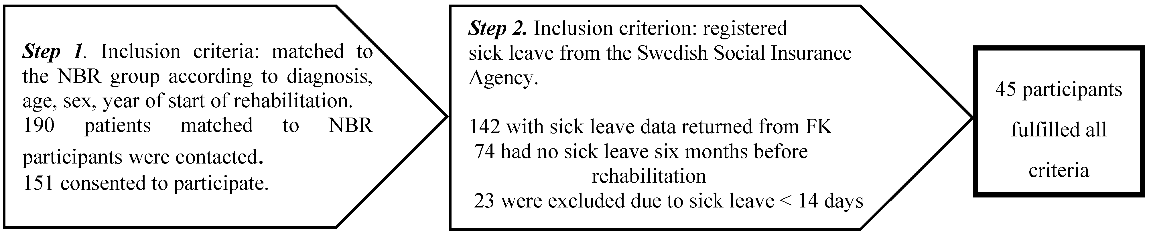 The selection of the OHS group was done in two steps. First, participants were matched as closely as possible to the NBR group concerning age, sex, diagnosis and year of rehabilitation start, giving 190 possible participants in this group. Of these, 151 consented to participate in the study; however, sick leave data returned from the Swedish Social Insurance Agency included only142 participants (see Figure 2). Sixty-eight of the 142 fulfilled the criteria of sick leave six months before rehabilitation start. However, as the ambition was to make the OHS group more similar to the NBR group with respect to sick leave, we decided to only include participants with more than 14 days of sick leave in the analysis, giving a total number of 45 subjects in the OHS group (see Figure 2).