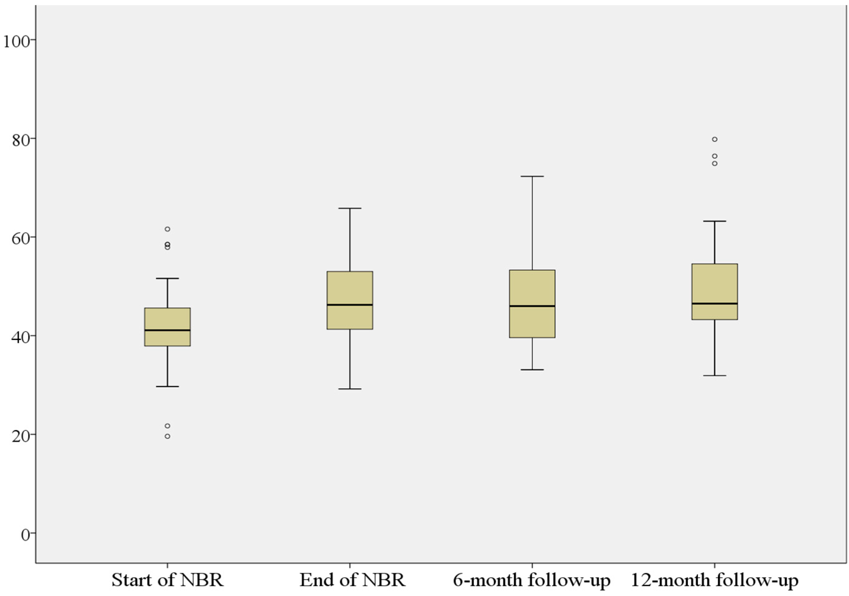 | NBR n = 44 | 19.2 (11.4) | 10.8 (8.9) | 10.7 (9.4) |