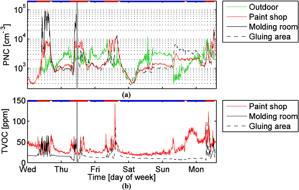 The processes that were observed over the course of the sampling period are typical of the activities at the shop on a weekly basis. Therefore, we would expect the workers to be exposed to similar concentrations of particles and TVOC on a repeated, daily basis. The measured particle number concentrations are in general representative for the particle number concentrations in the respective rooms. In the paint shop and gluing area the emitted number of particles was not substantial, so the gradients must have been small, and thus the measurements in these places are representative. In the molding room measurements with the portable CPC showed that the gradient was small except during and briefly after the spraying. In this room the VOCs originated from the same source, so we expect the same to hold true for VOC concentrations. In the gluing area the TVOC sources were small most of the time, so we expect that the gradient was small as well. However, during the spray gluing the measurements were probably not so representative. In the paint shop there were substantial VOC sources and the TVOC concentration gradients may have been considerable. However, the measurements are representative enough to conclude that the TVOC concentration was substantially higher in the paint shop than in the other locations. In the exposure assessment, it must be kept in mind that stationary measurements may underestimate [51,52] or overestimate [53] the personal exposure concentrations.