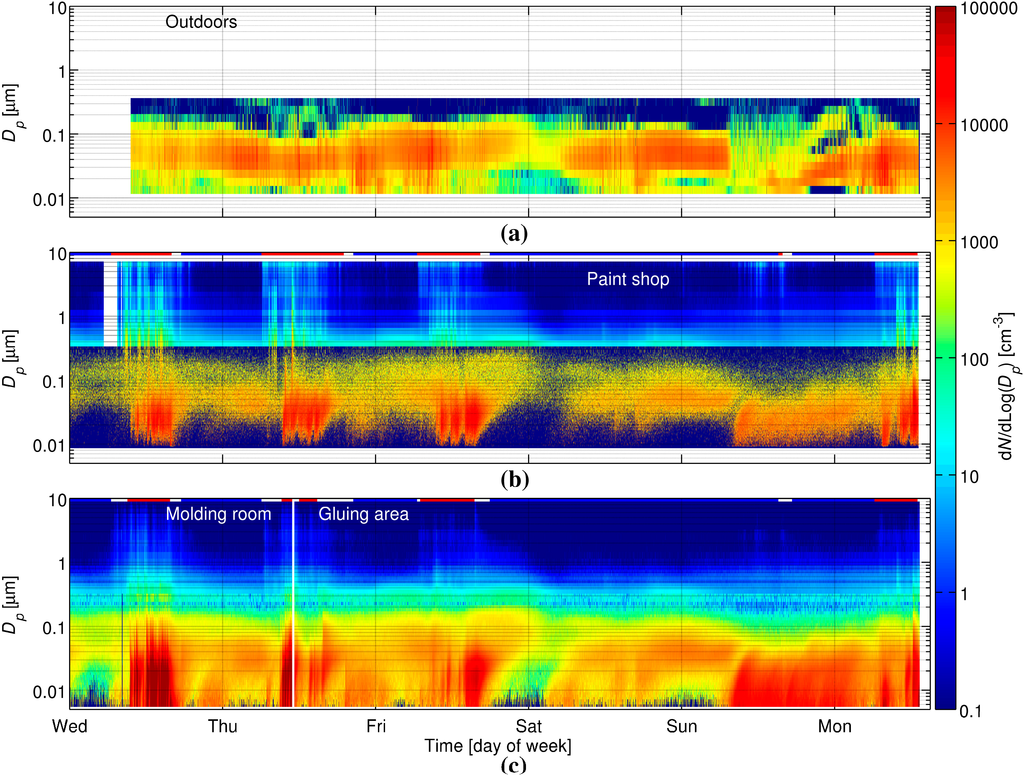 Figure 3 shows that during working hours, the particle number concentrations were highest in the molding room, but during non-working hours the concentrations were similar in the molding room and the paint shop. The paint shop and the gluing area had very similar particle number concentrations most of the time. The mean working hour particle number concentration was 36,000 cm−3 in the molding room. This is a relatively high concentration, far above the working hour concentrations measured in the other locations (4500 cm−3 in the paint shop, 3300 cm−3 in the gluing area, 2500 cm−3 outdoors), but it is far from being exceptional in occupational settings [2,43,44]. The outdoor mean was calculated for the working hours in the paint shop.