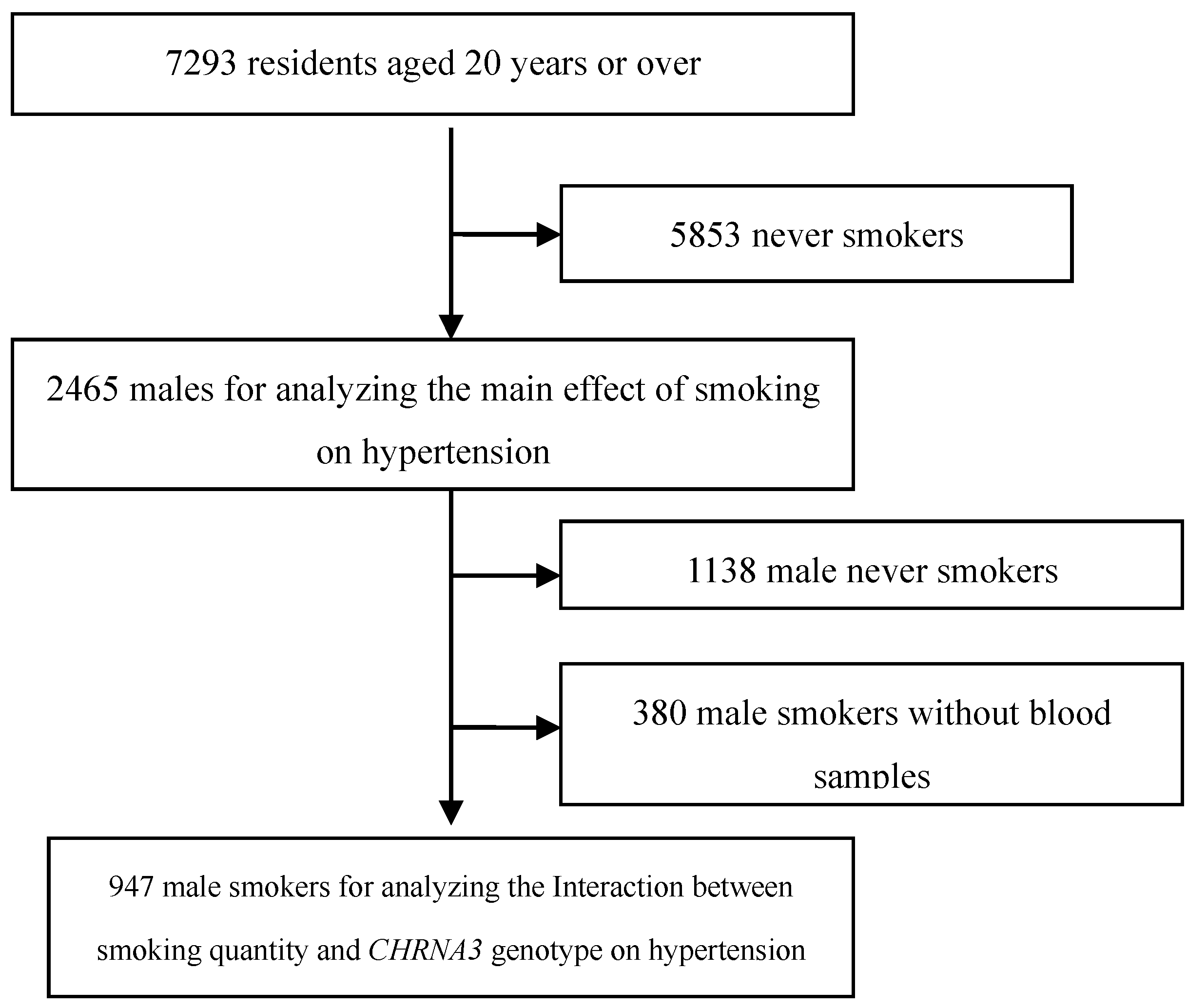 To minimize the confounding effects of smoking status and gender, only the data provided by male smokers were used to assess the interaction effects of daily cigarette consumption and CHRNA5-CHRNA3-CHRNB4 polymorphism on hypertension. Among the 2465 males, 1327 were smokers, of them, 380 failed to provide the blood samples required to detect CHRNA5-CHRNA3-CHRNB4 polymorphisms, and were thus excluded from the study. The final sample comprised 947 male smokers (Figure 1). The study was conducted in accordance with the Declaration of Helsinki, and the protocol was approved by the Ethics Committee of Sun Yat-Sen University in Guangzhou, China (Approval No. 2013 [8]). The written informed consent was obtained from all of the participants before the survey was started.