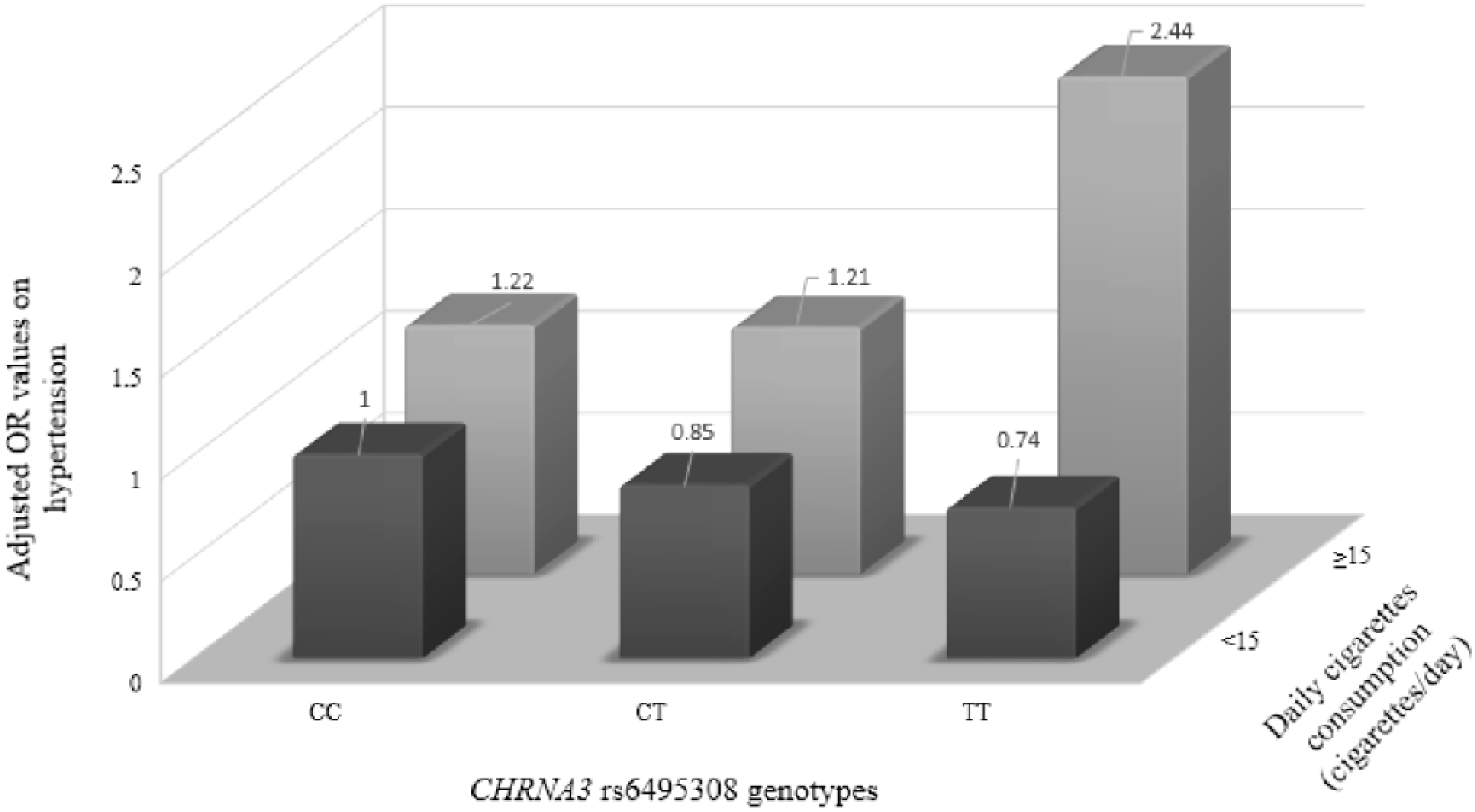 In sum, the findings of our study indicate that the CHRNA3 rs6495308 genotype is an effect modifier of the association between daily cigarette consumption and hypertension in Chinese male smokers. This finding offers new insights into the causal relationship between smoking and hypertension.